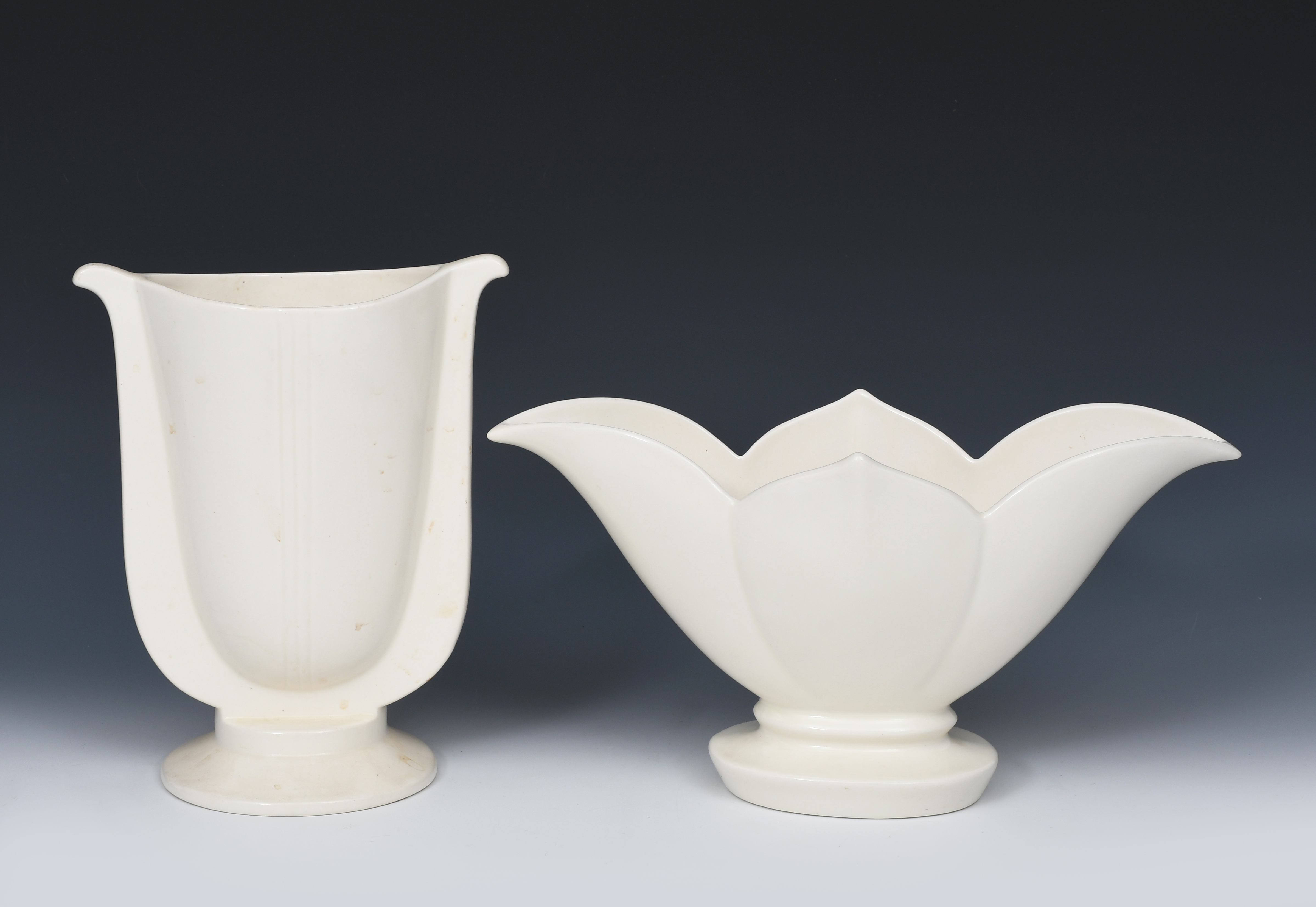 A The Fulham Pottery Harp vase, footed form, covered in a white glaze, and a The Fulham Pottery Lotus vase, printed factory marks, 26cm. high (2)