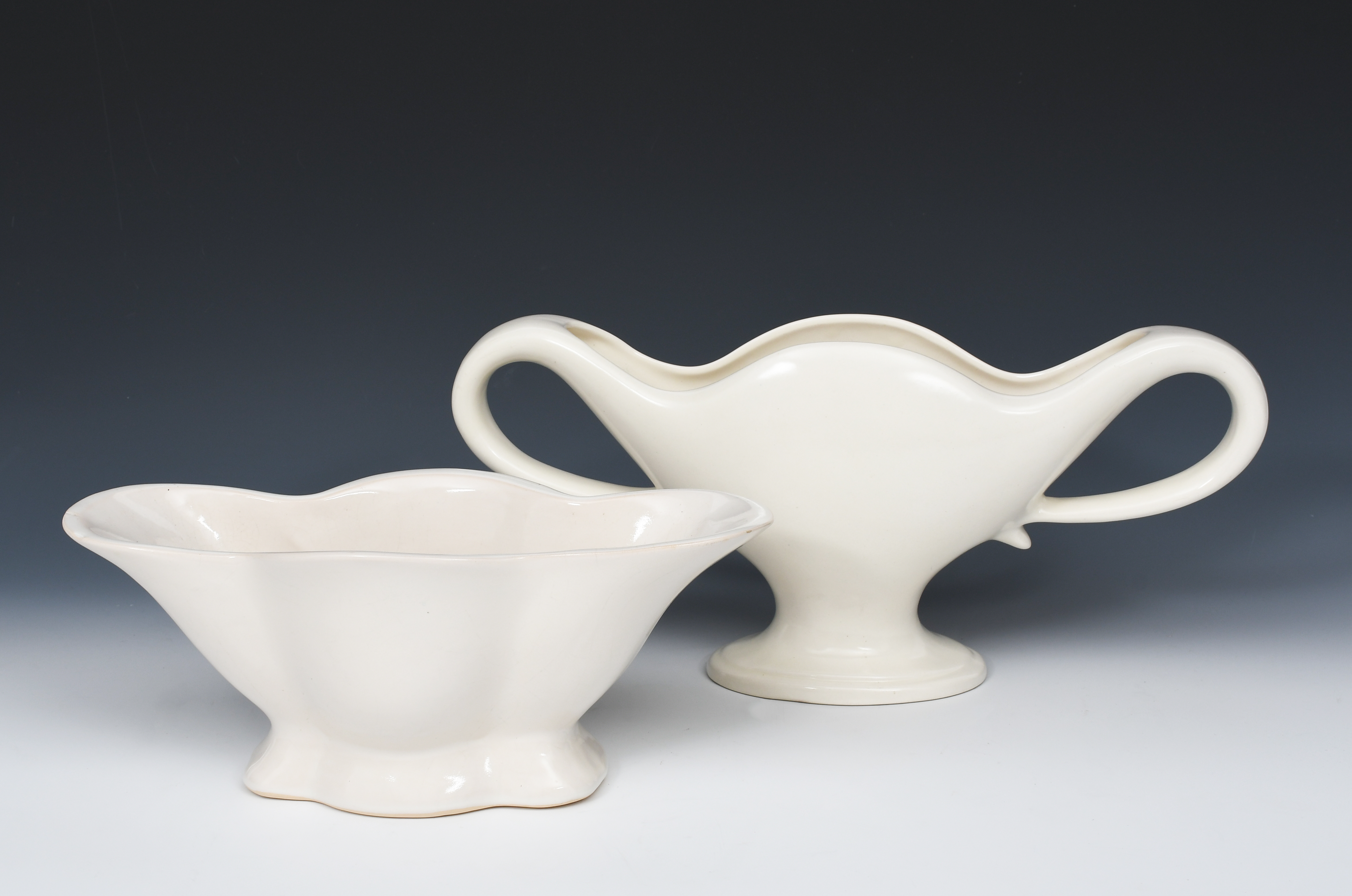 A Fulham Pottery vase designed by Charles West, model WDK, footed, flaring form, covered in a white glaze, and a larger Fulham Pottery twin-handled flower vase, impressed and incised marks, 33.5cm. wide. (2)