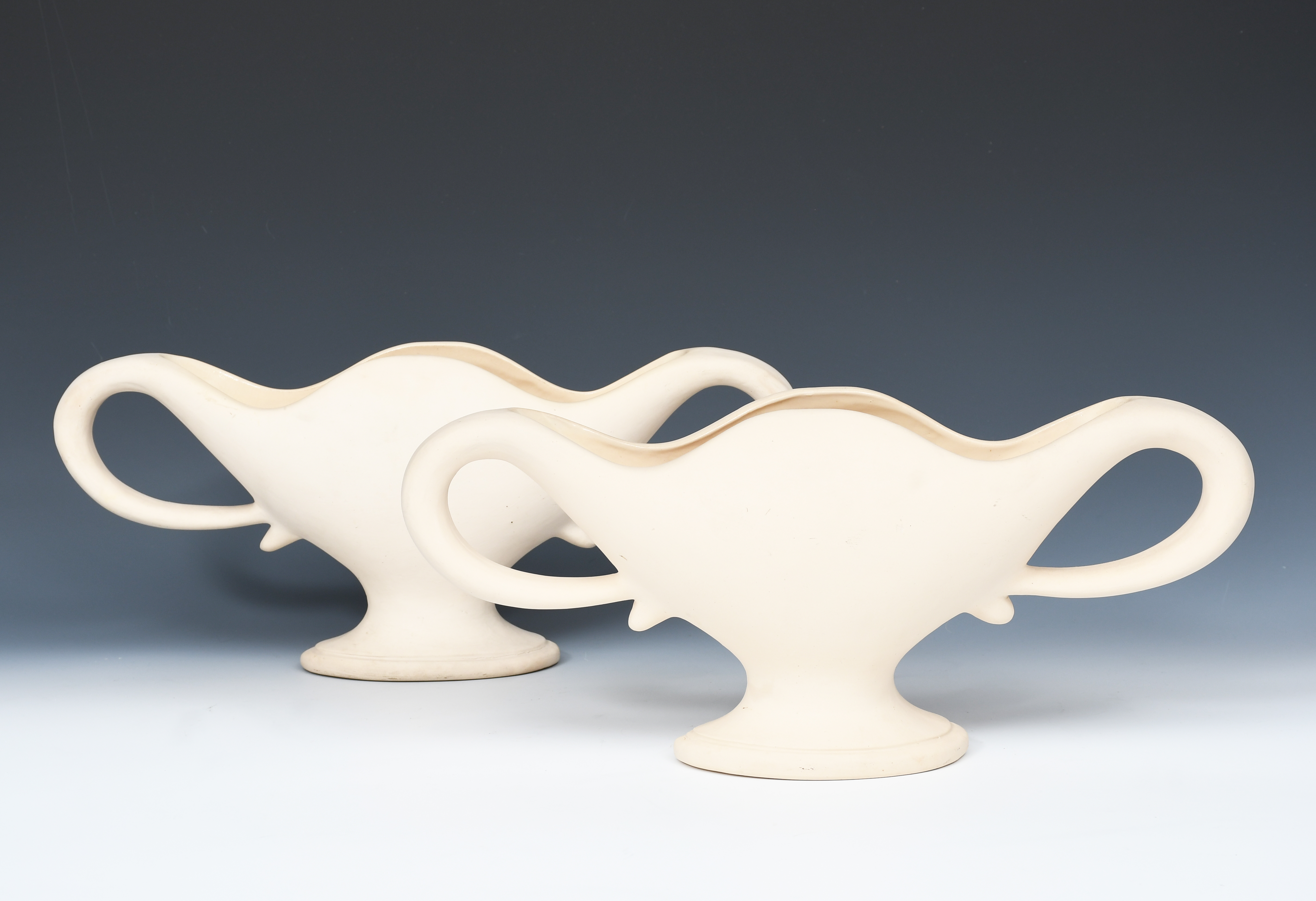 A pair of Fulham Pottery twin-handled flower vases designed by William John Marriner, shaped FMB, footed twin-handled form with wavy top rim, glazed to interior, impressed and incised factory marks, 44cm. wide, (2)
