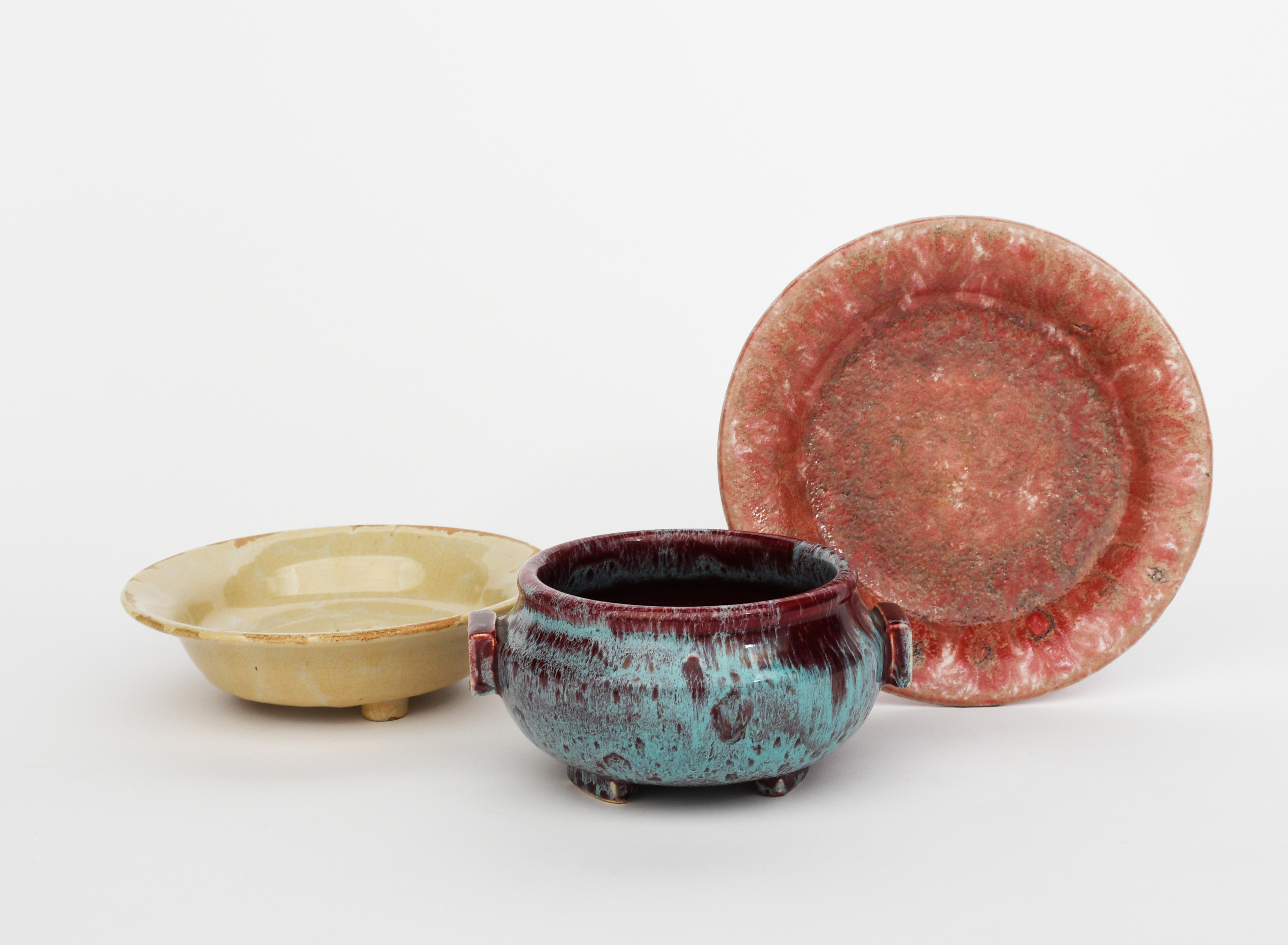 a Soon Pottery bowl on three lug feet, covered in a pale yellow splitting glaze, a Coldrum Pottery bowl on three feet and a cauldron, incised Soon, 16cm. diam. (3)