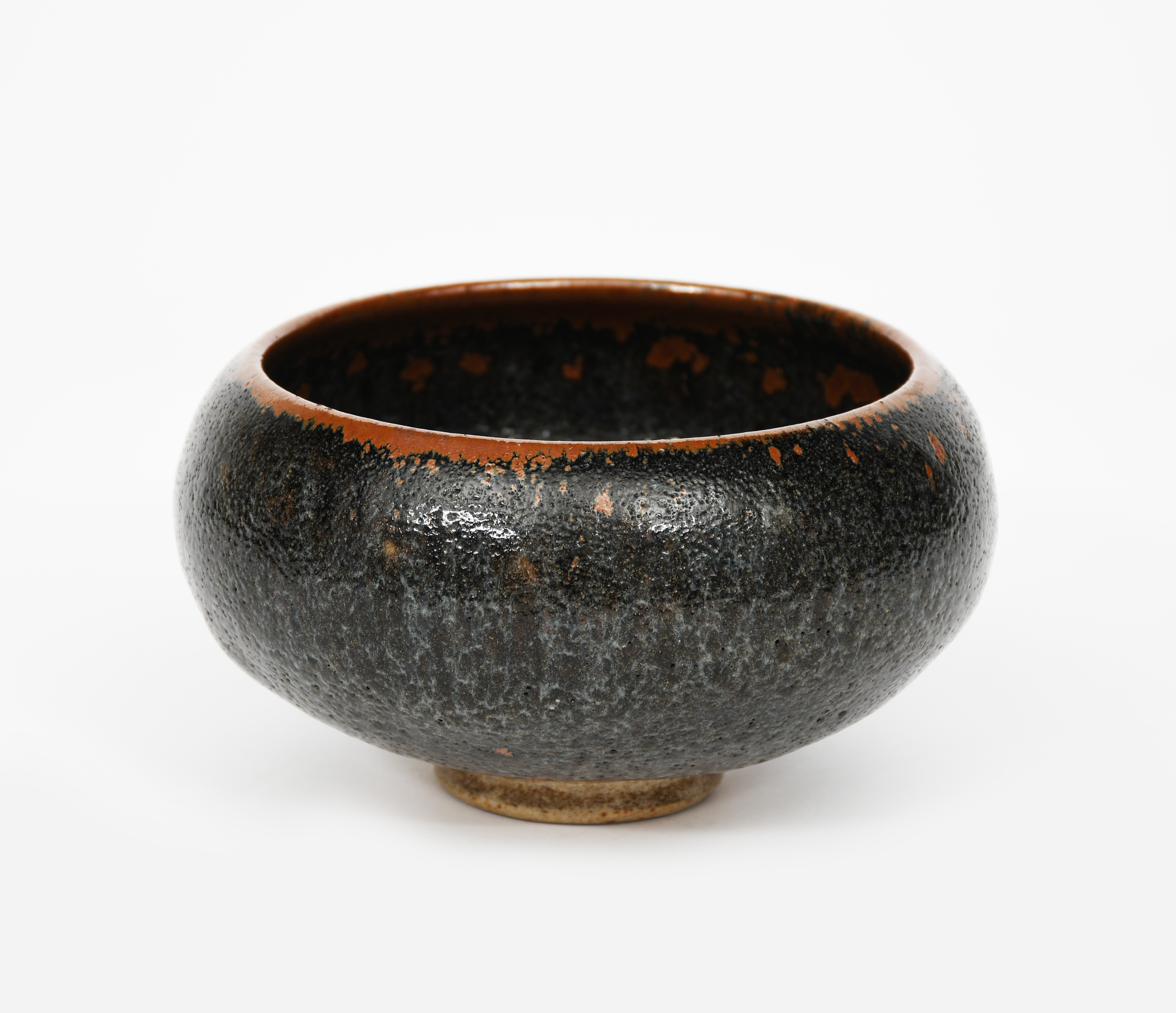 a stoneware footed bowl with inverted rim, covered in a rich textured tenmoku glaze with rust rim and specks impressed seal mark, fine hairline to top rim,13.5cm. diam.