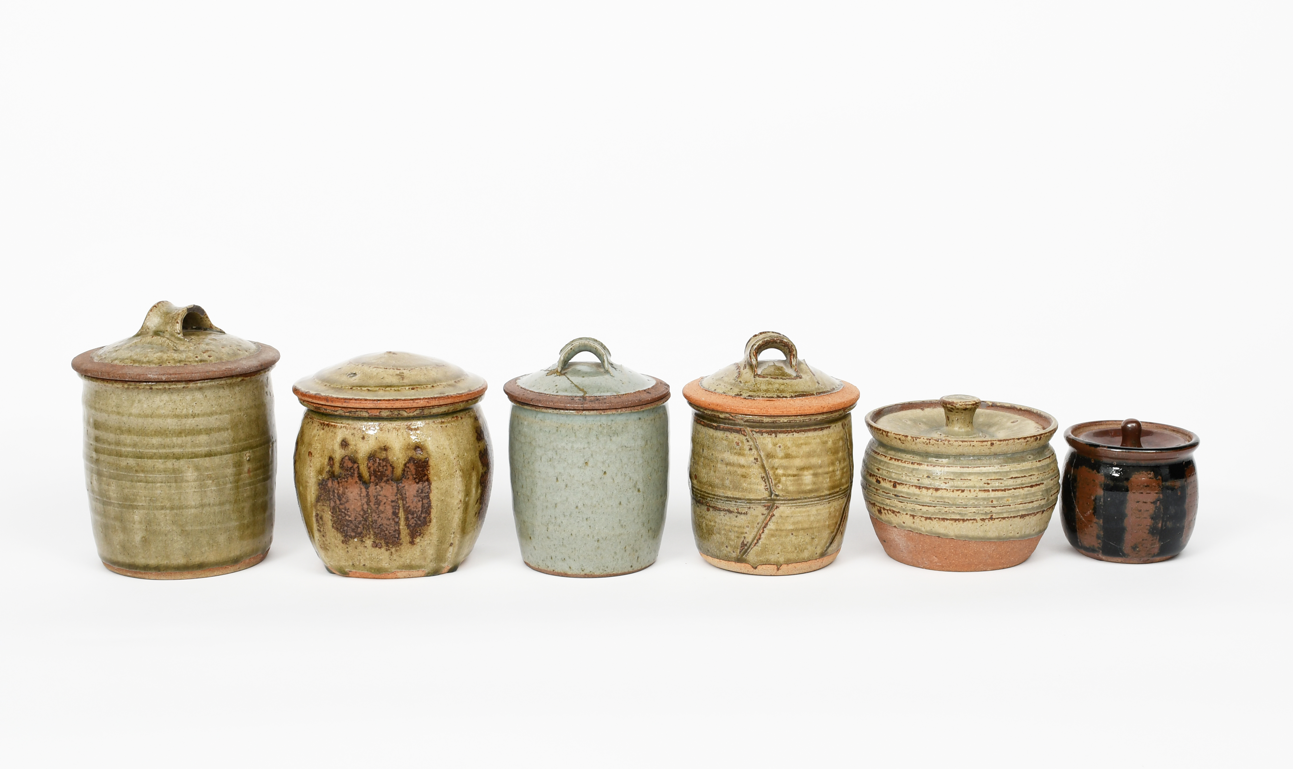 an early beaten stoneware little jar and cover, covered in an ash glaze with tenmoku patches, another cylindrical jar and cover with cut decoration, covered with an ash glaze, with paper label dating it to 1968, a taller cylindrical jar and cover and three other covered jars all by Richard Batterham,