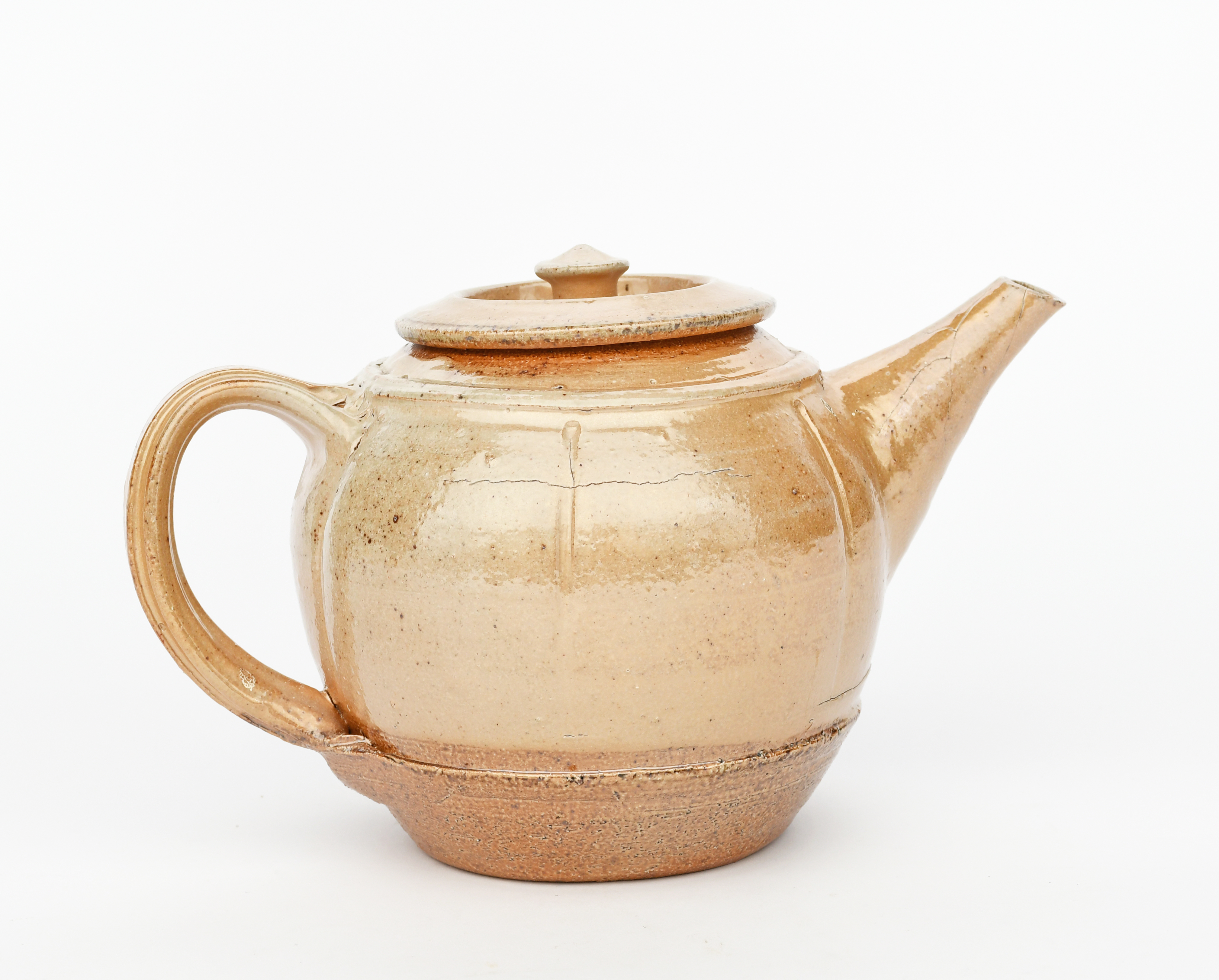 a salt-glazed Melon teapot and cover, ovoid with vertical ribs, covered in a translucent speckled glaze,