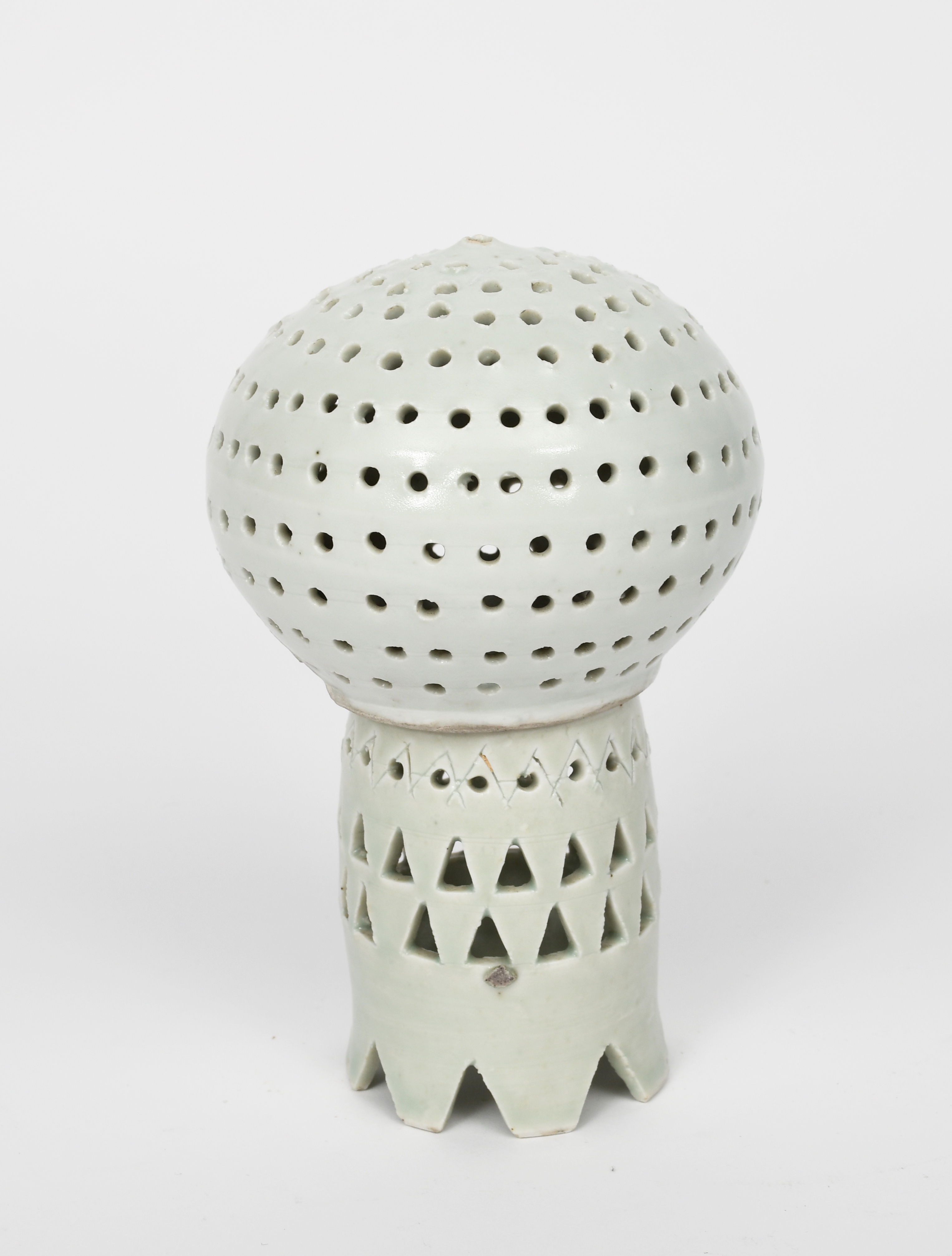 a rare early porcelain light and shade, pierced pagoda form, covered in a celadon glaze,