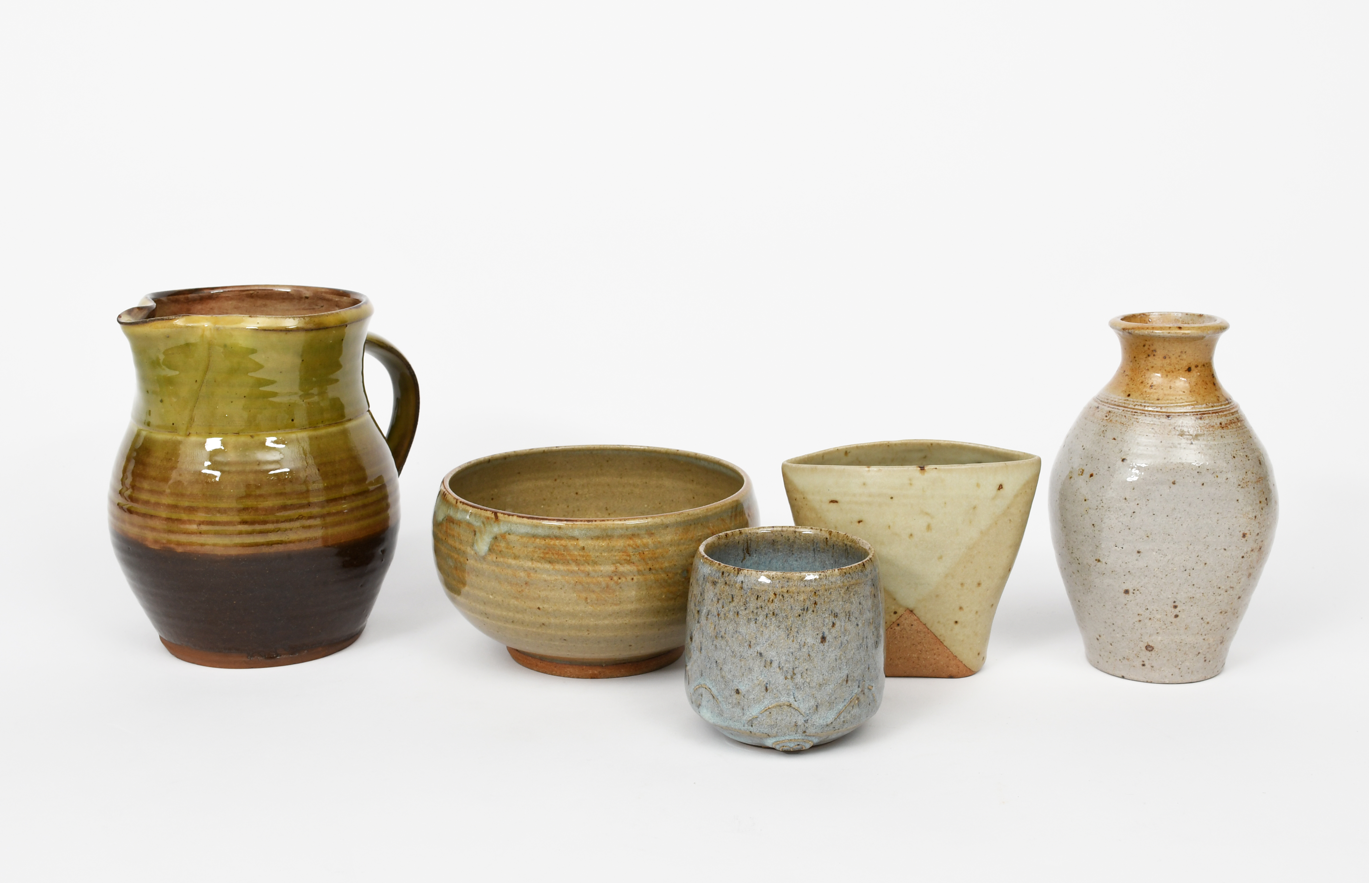 a bowl, footed form with simple translucent glaze, another vase similar, a Sidney Tustin jug and two other vases,
