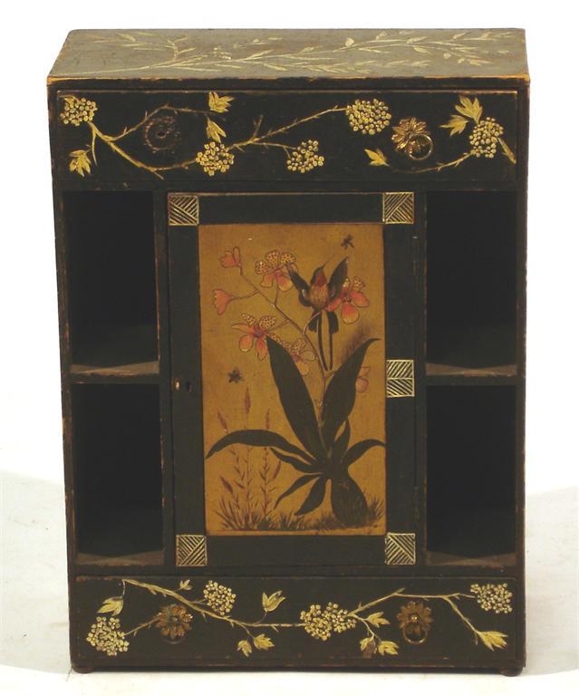 An Aesthetic Movement ebonised wood cabinet, with painted humming bird panel.