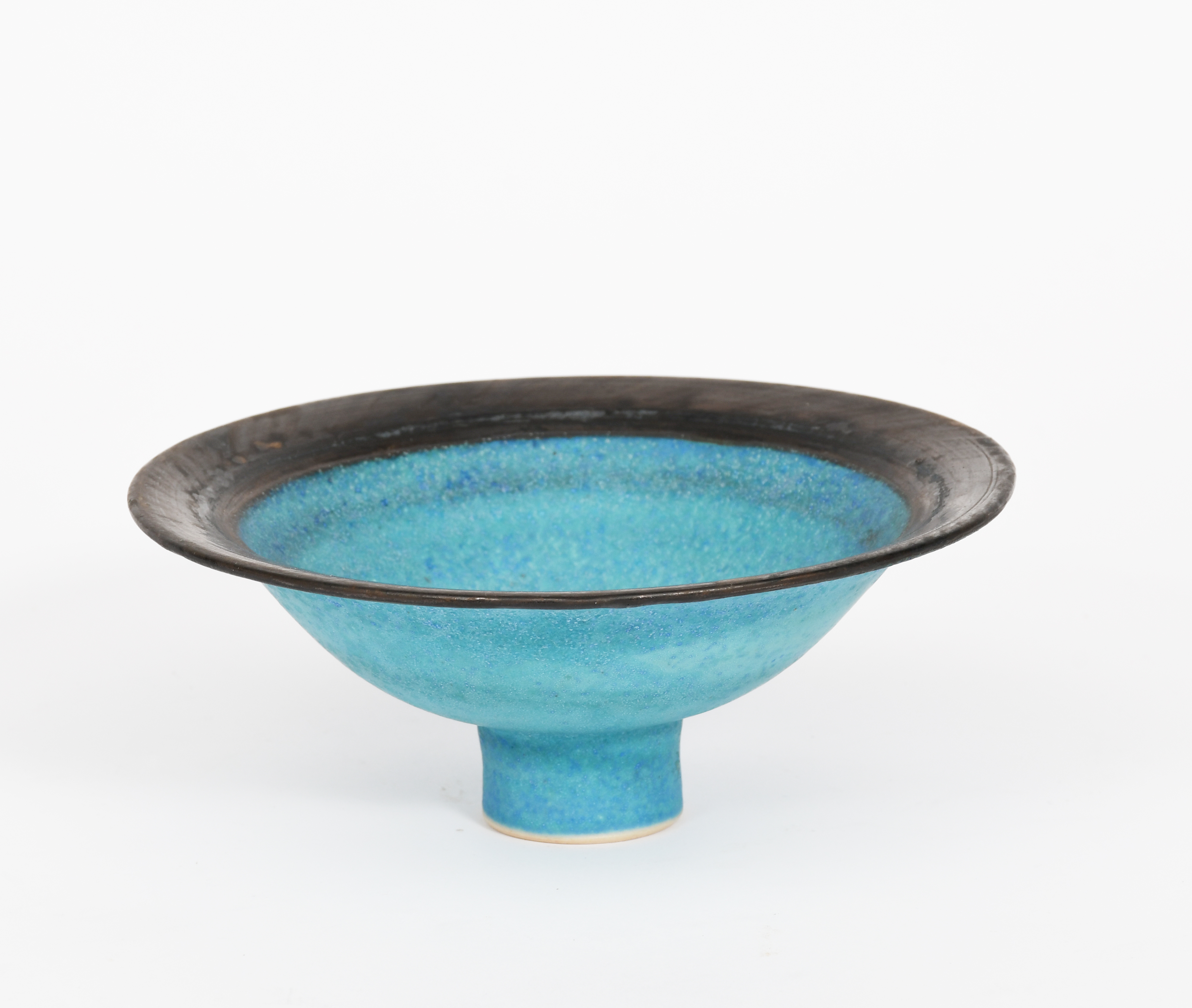 a porcelain footed bowl, covered in a pitted blue glaze, the rim highlighted with manganese band, and two glass vases decorated with orange and black panels,