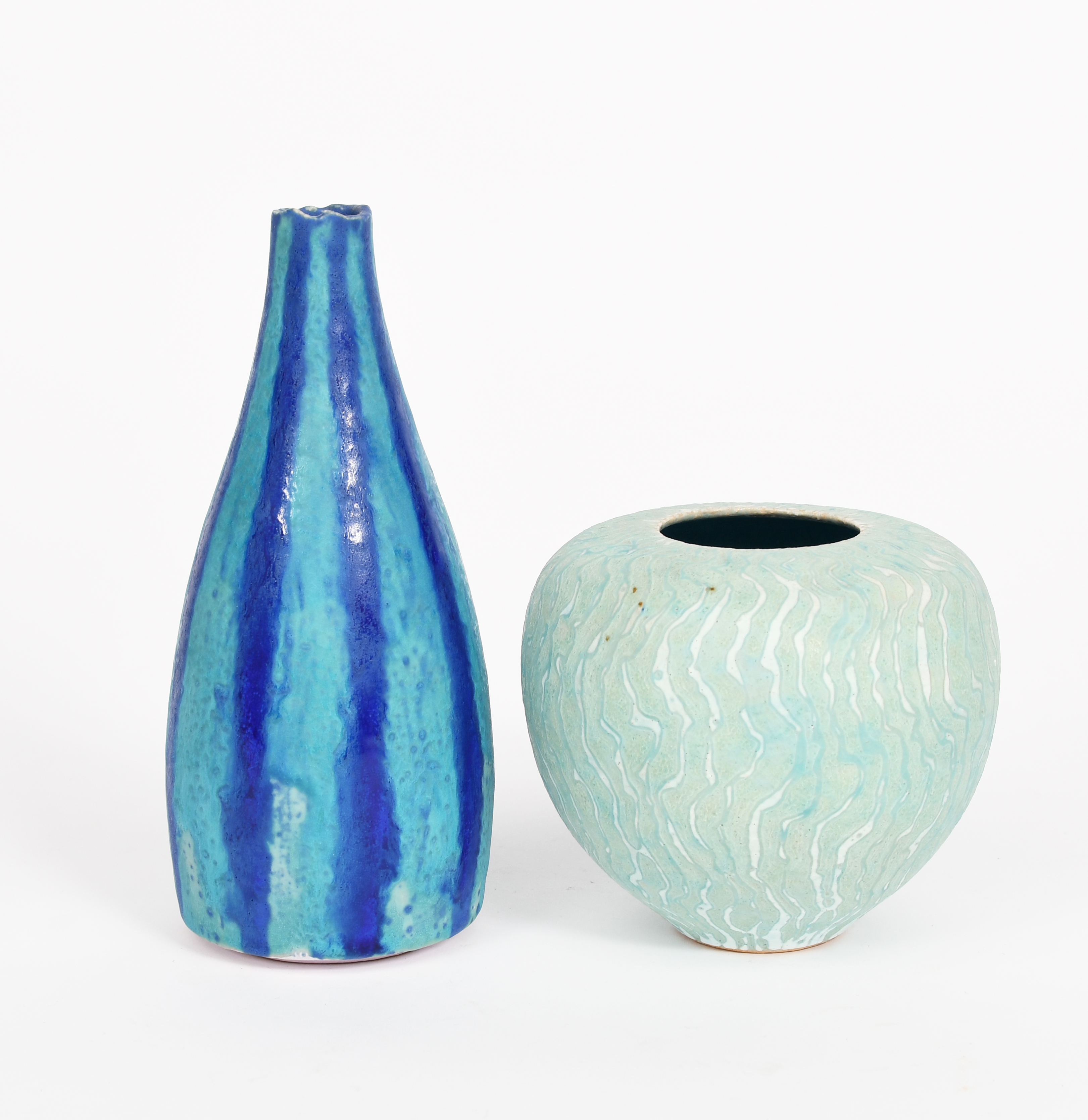 a stoneware vase with inlaid blue veins, ovoid form, and another solifleur vase by Peter Beard,