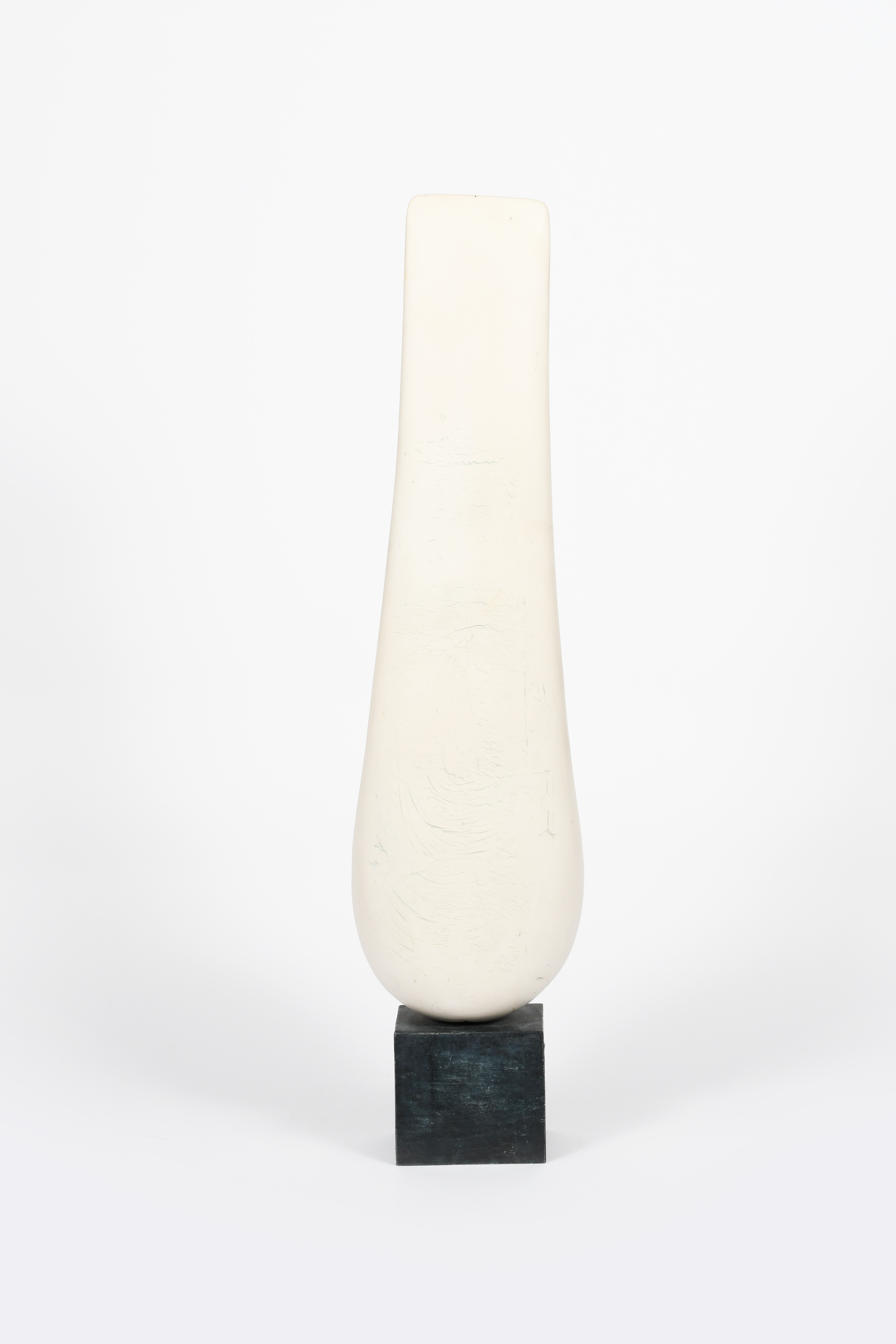 a raku pottery figure, white with pale blue highlights, on polished slate base