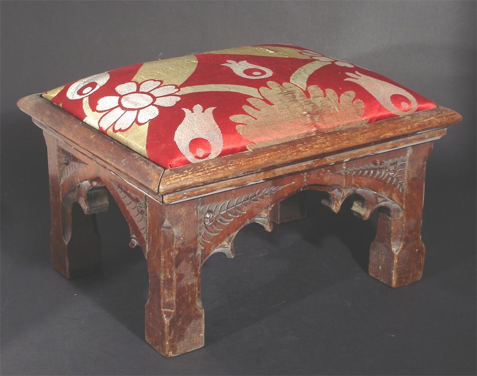 A Gothic Revival pine stool with drop in silk seat unsigned 40 x 33cm.