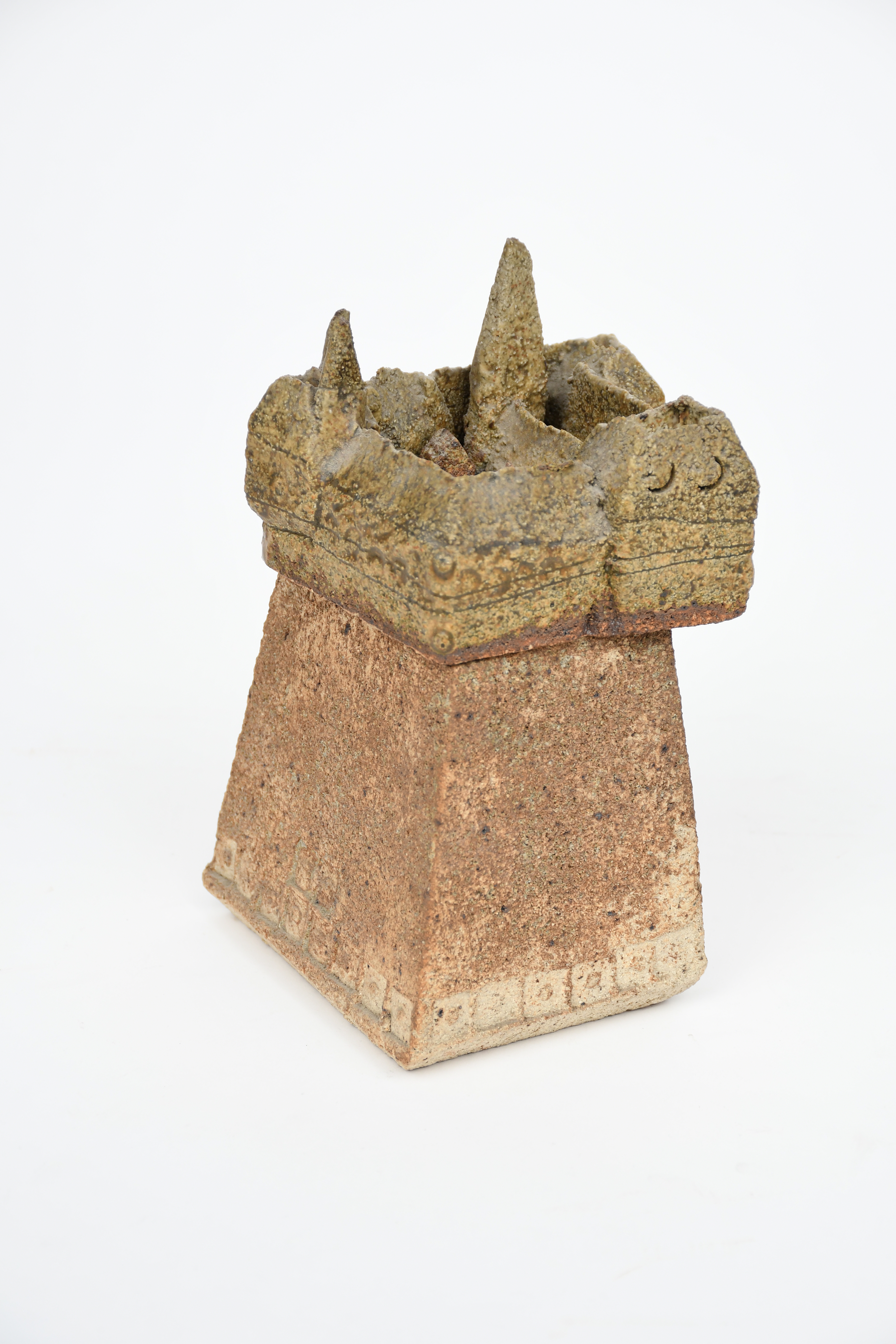 stoneware sculptural vessel and cover with impressed decoration, the cover with six small loose buildings, and a similar townscape of fifteen small buildings,