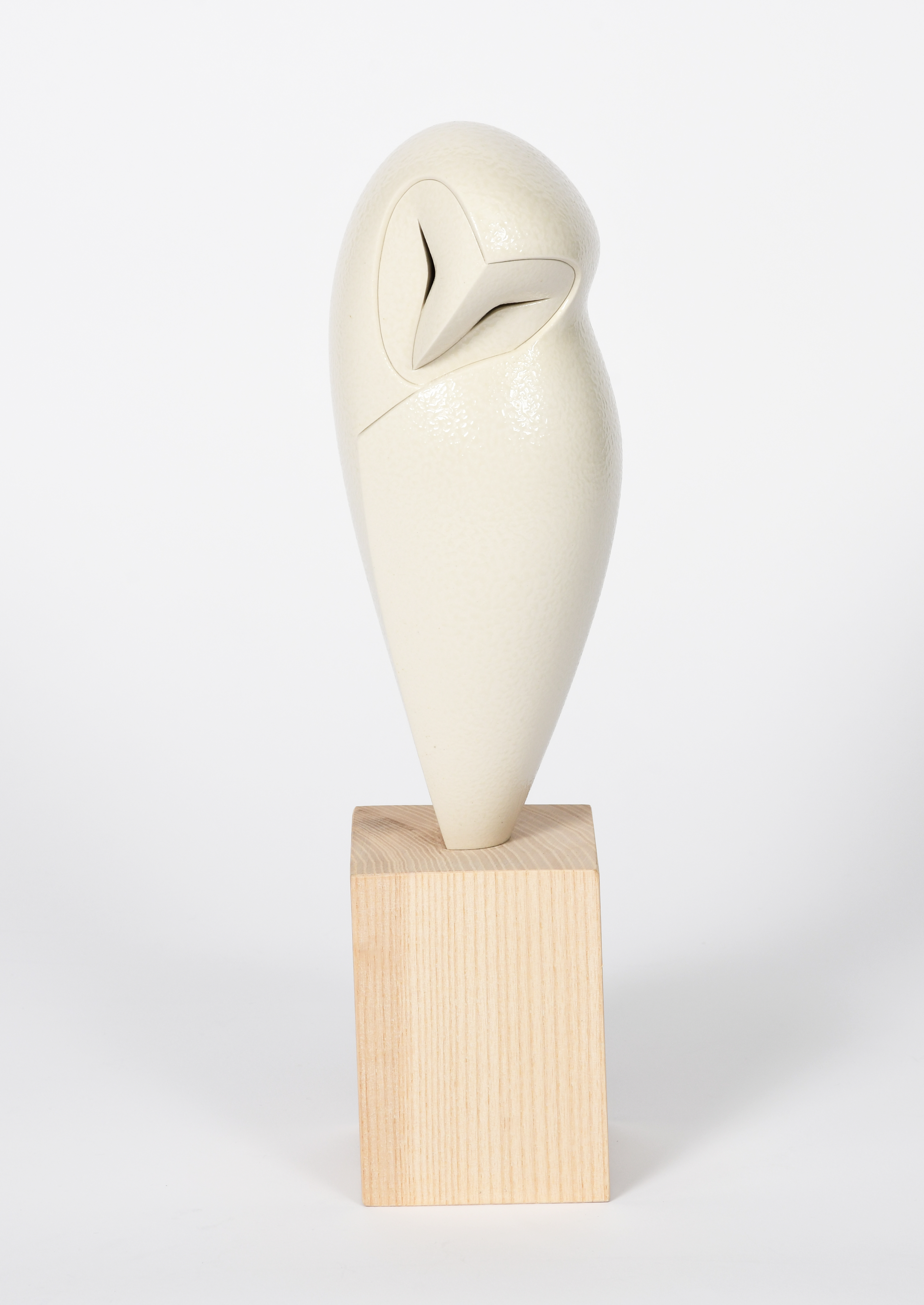 salt-glazed ceramic sculpture of a perched barn owl, on wooden plinth