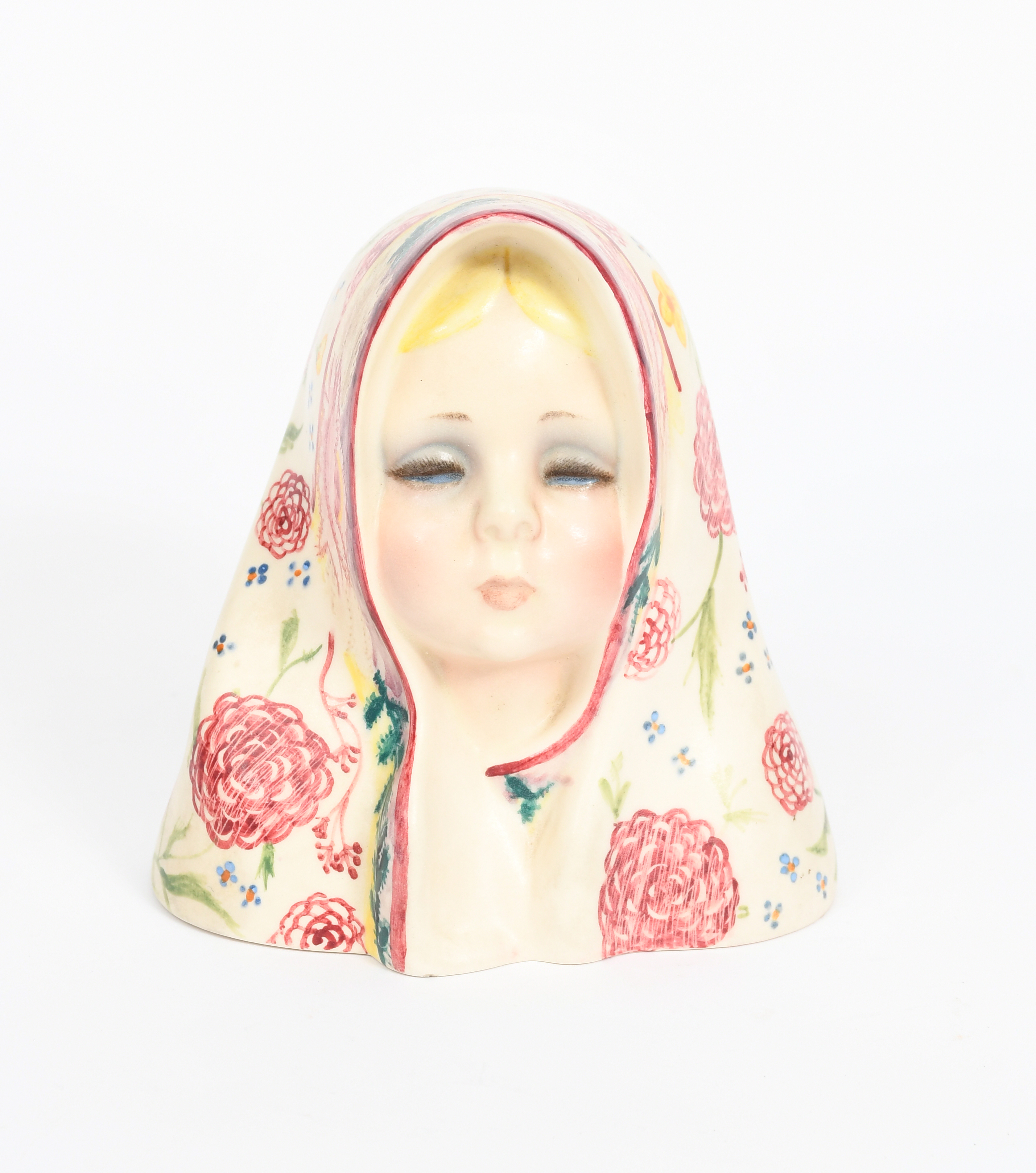 An Essevi Pottery bust of a young woman, wearing headscarf, painted with flowers and foliage in colours on a cream ground, painted factory marks, 16.5cm. high
