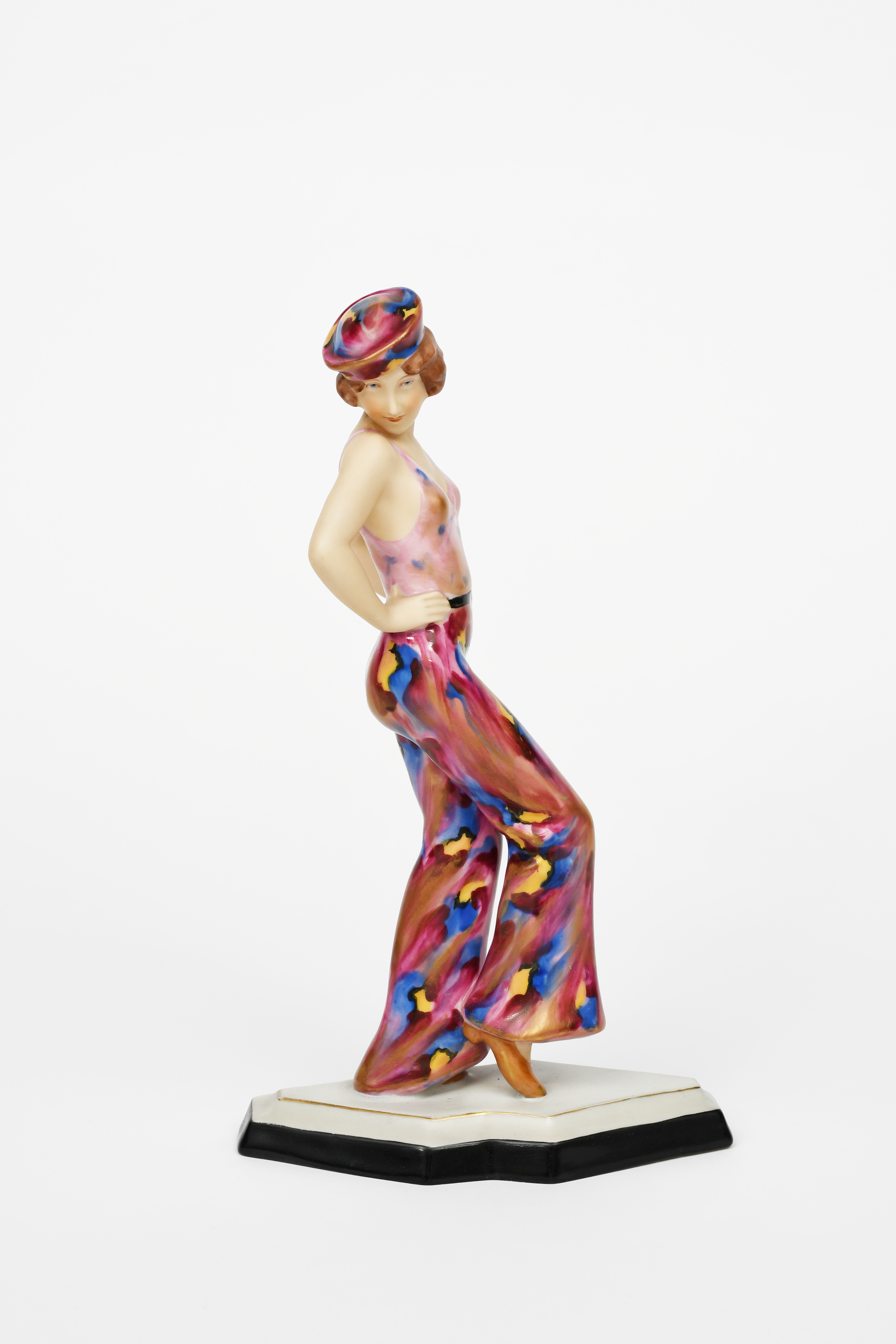 A Royal Dux model of an Art Deco sailor girl by Schaff, model no.3230, modelled standing in pantaloons and sailor's cap painted in shades of pink, purple, blue and yellow, highlighted in gilt, on shades base, applied pink triangle mark and impressed marks, professional restoration to base, 27cm. high