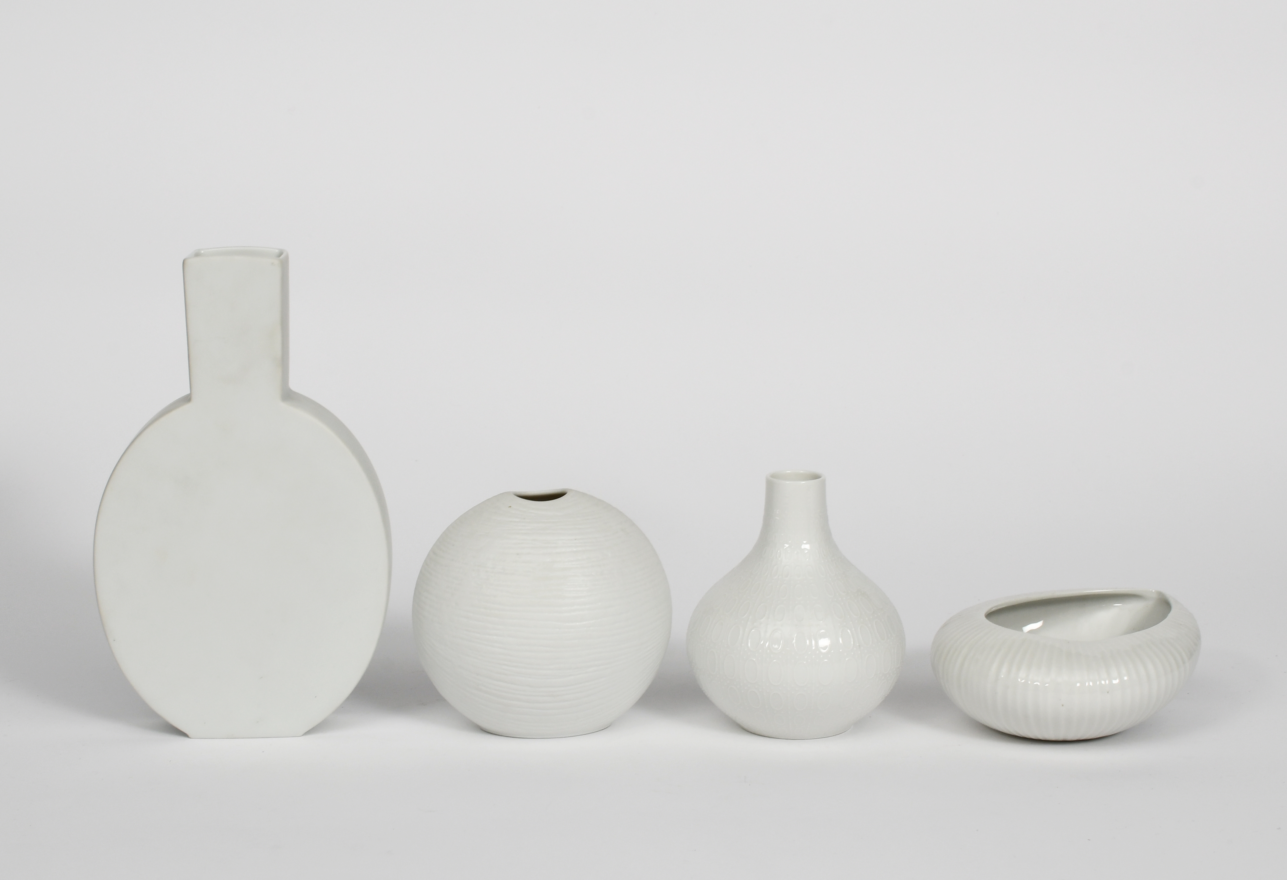 A Rosenthal Studio Line porcelain vase, ovoid with tapering cylindrical neck, cast in low relief with geometric columns, another shell form vase and two other Rosenthal Studio Line vases, printed factory marks, 12cm. high, (4)