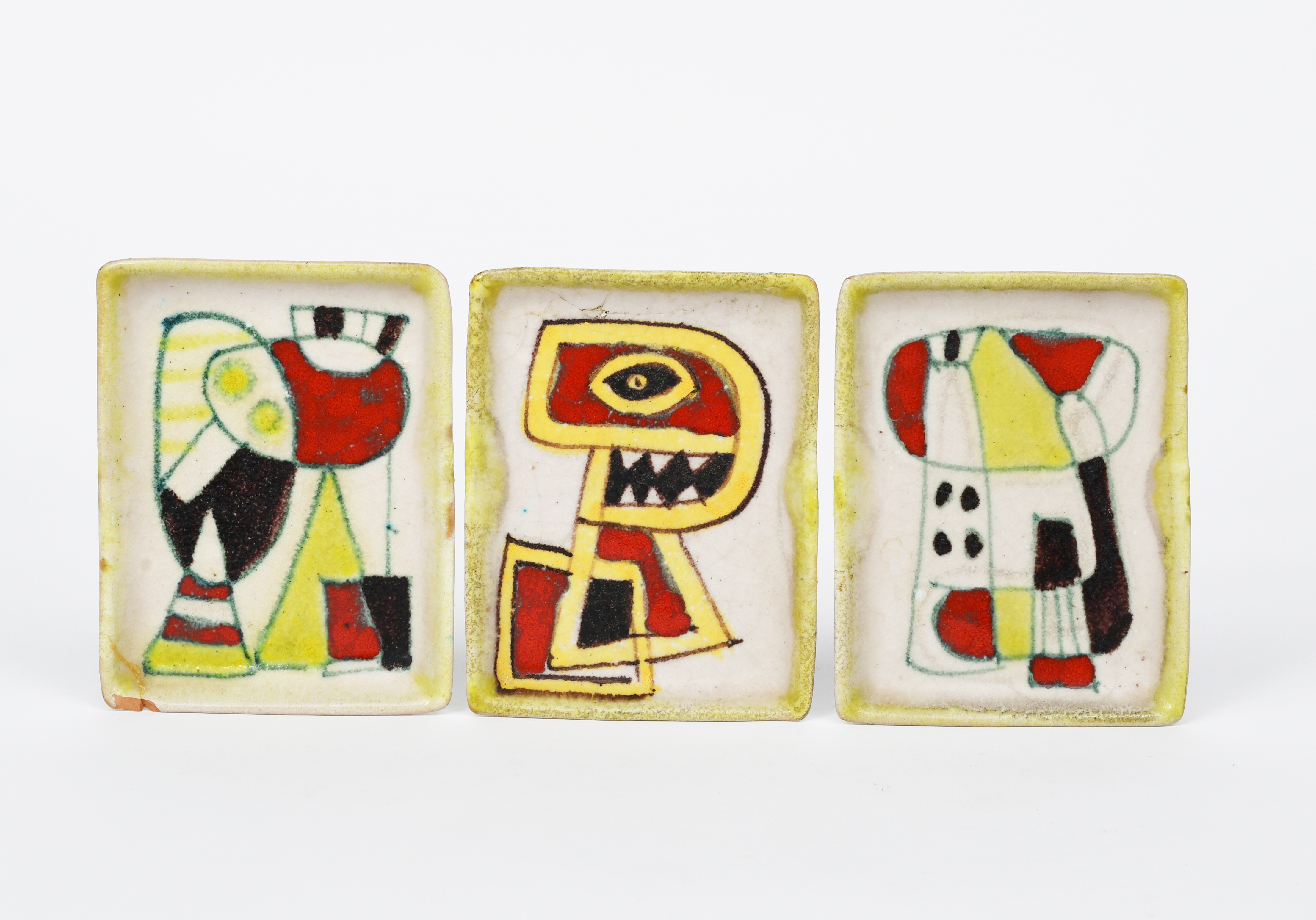 A Guido Gambone Pottery dish, rectangular form, painted with an abstract figure design in red, yellow and black on a white ground, and two other Gambone dishes similar, painted monogram, Gambone Italy, damages to two, 14 x 11cm. (3)