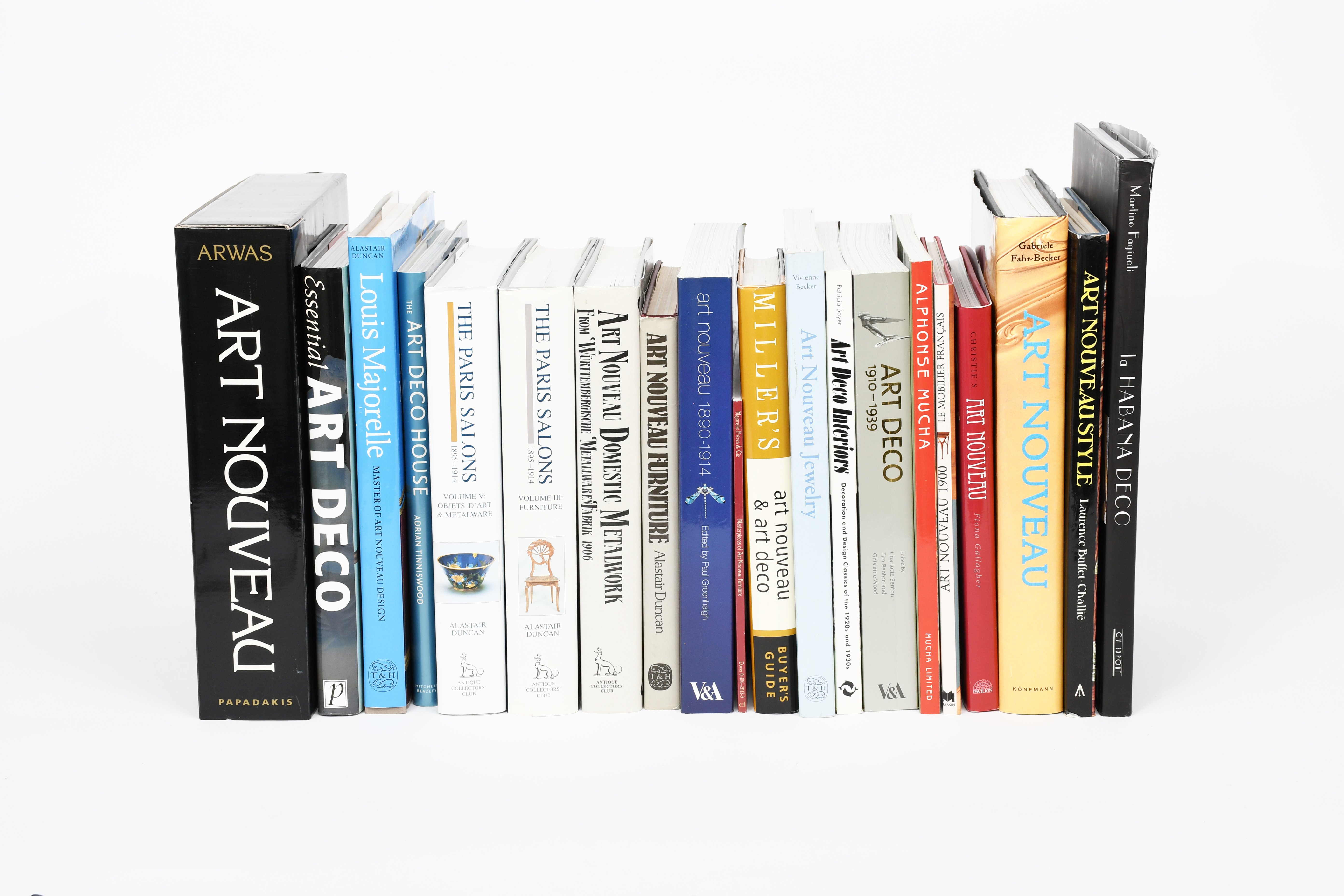 'Art Nouveau The French Aesthetic' a book by Victor Arwas, published by Andreas Papadakis, and books on Art Nouveau, Art Deco and design including; 'Louis Majorelle' by Alastair Duncan, `The Paris Salons' Vol III (Furniture), Vol IV (Objets D'Art and Metalware), Art Nouveau Jewellery' by Vivienne Becker, and Art Nouveau Domestic Metalware (WMF), (20 books)