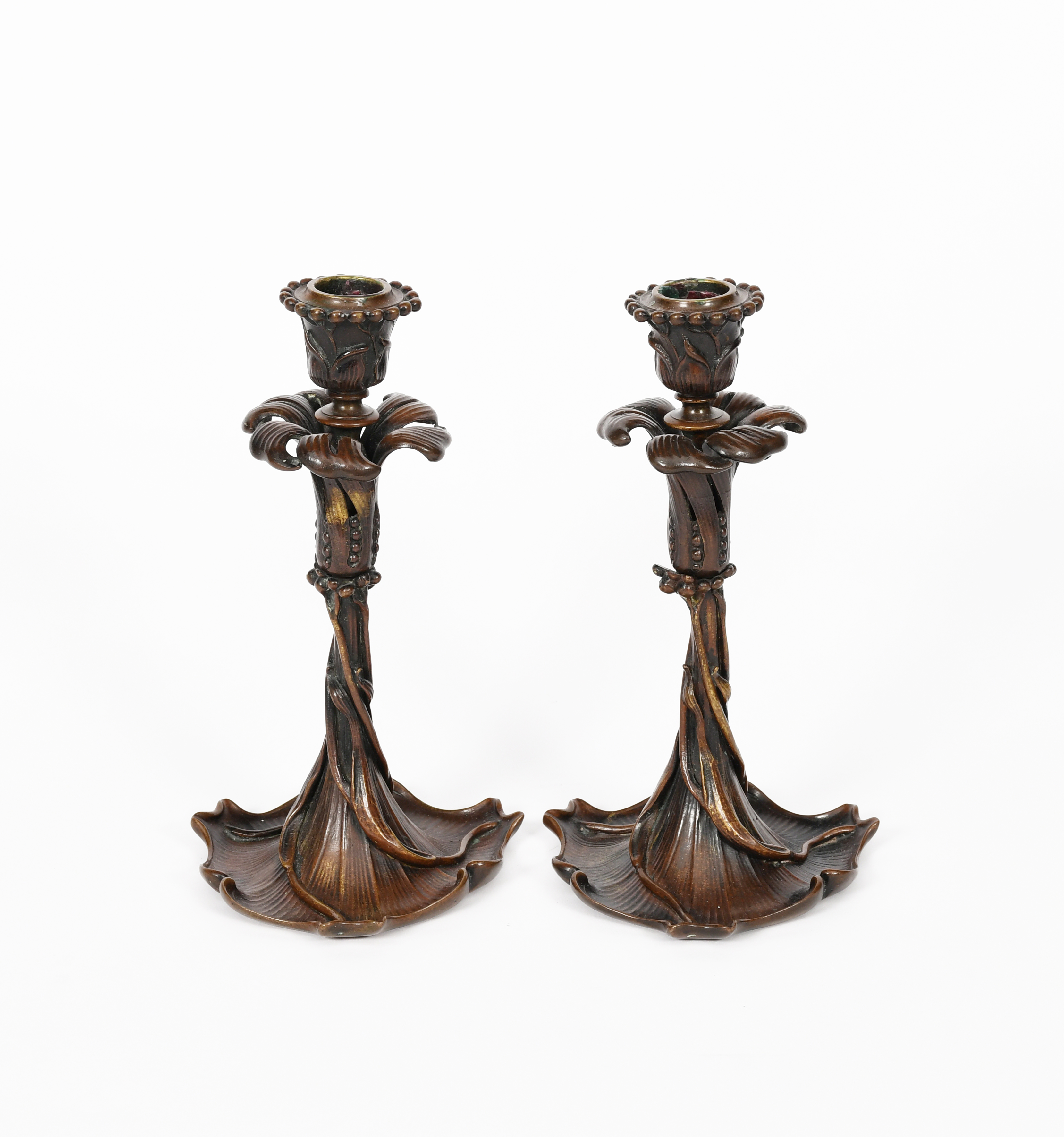 A pair of patinated bronze candlesticks possibly American, each modelled as an Art Nouveau flower stem, the bud sconce with a border of berries, unsigned, 22cm. high, (2)