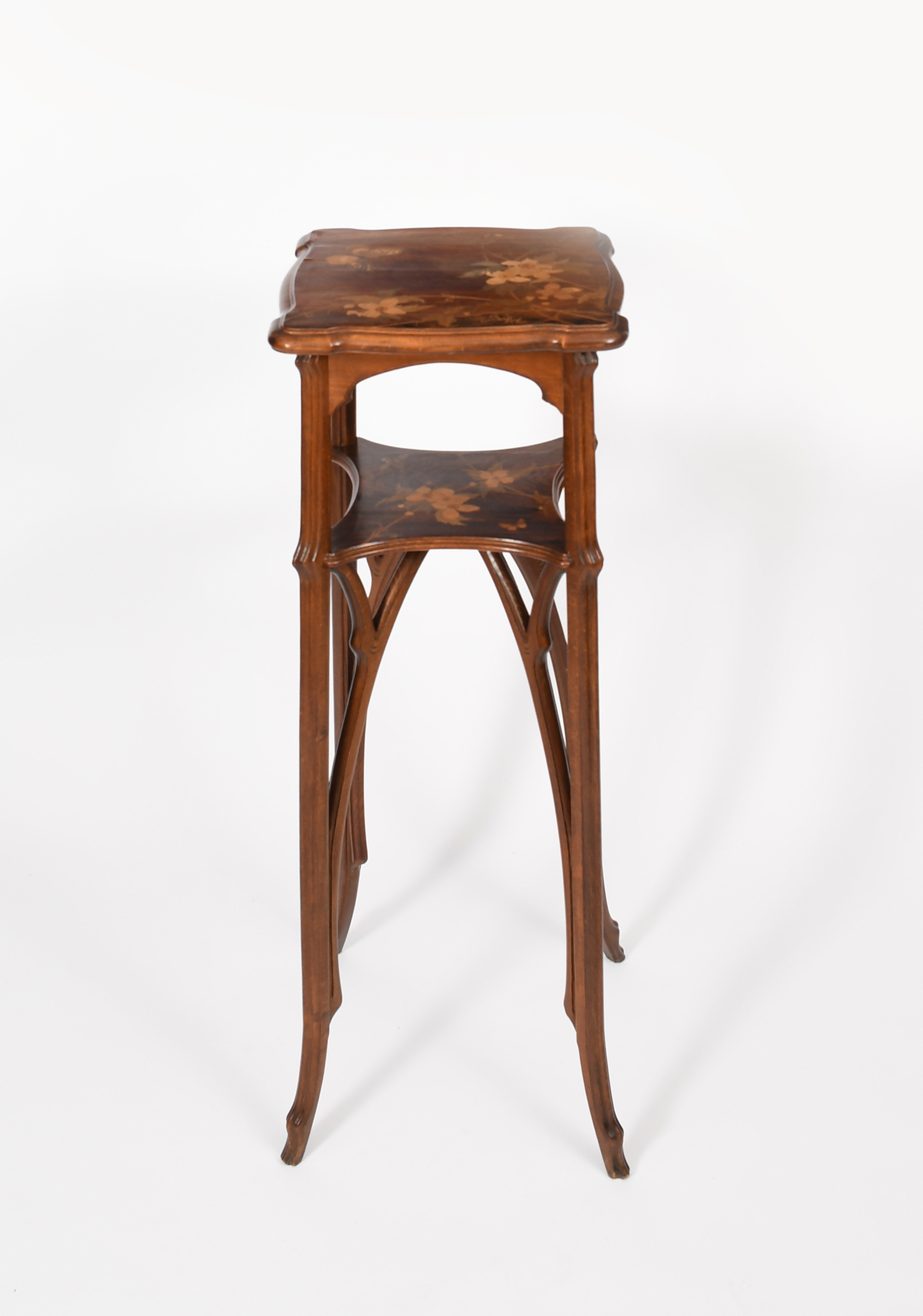 An Art Nouveau Galle marquetry pedestal stand, shaped, square section top inlaid with marquetry butterfly flying by clematis flowers and foliage, above a shaped shelf, on four flaring, shaped legs with brackets, signed in the marquetry Galle,