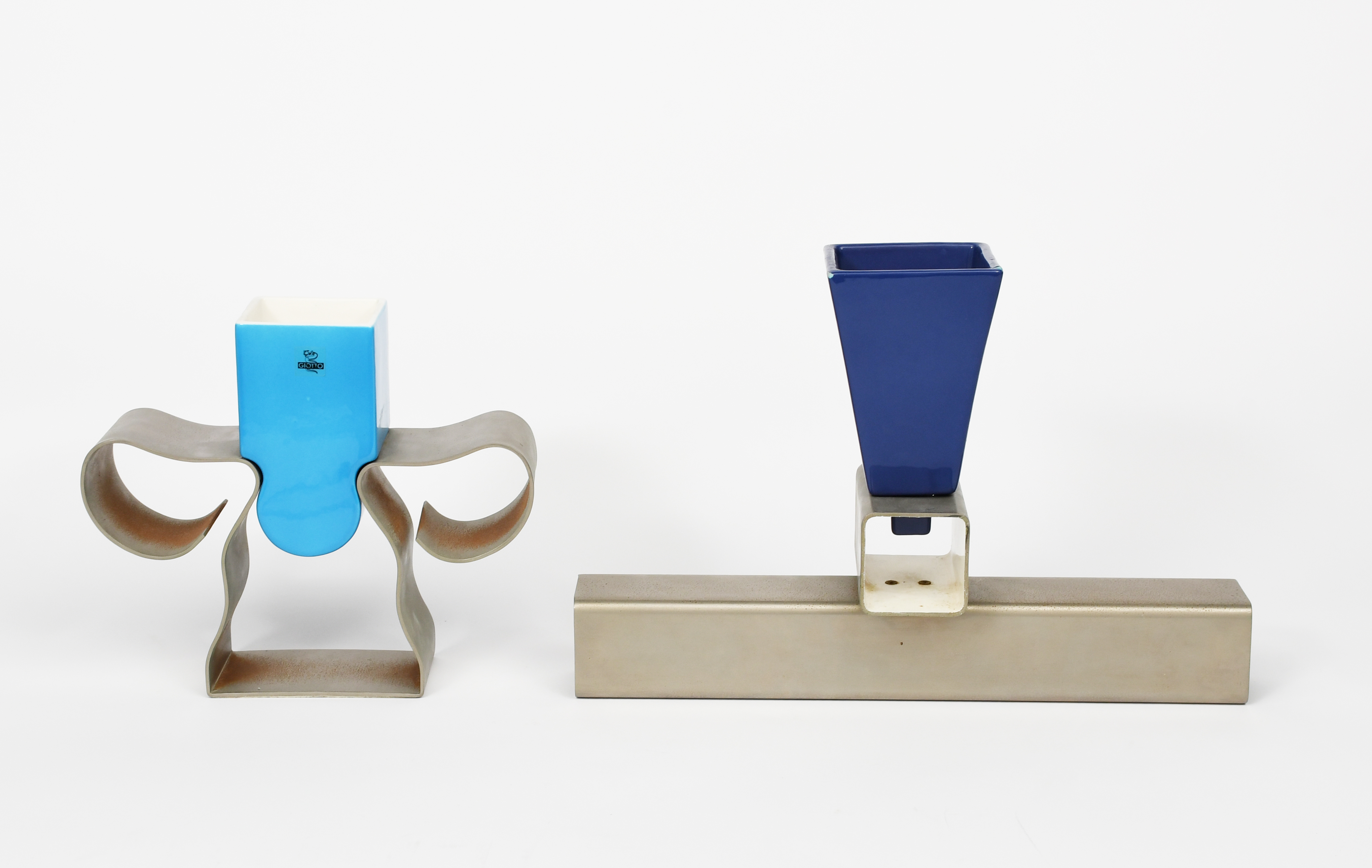 A Giotto ceramic vase in metal stand designed by Johanna Grawunder, designed 1991, tapering blue ceramic vase in wave polished chrome frame, and another Giotto vase and stand by the same designer, applied Giotto labels, second vase chipped, 22.8cm. high (4)