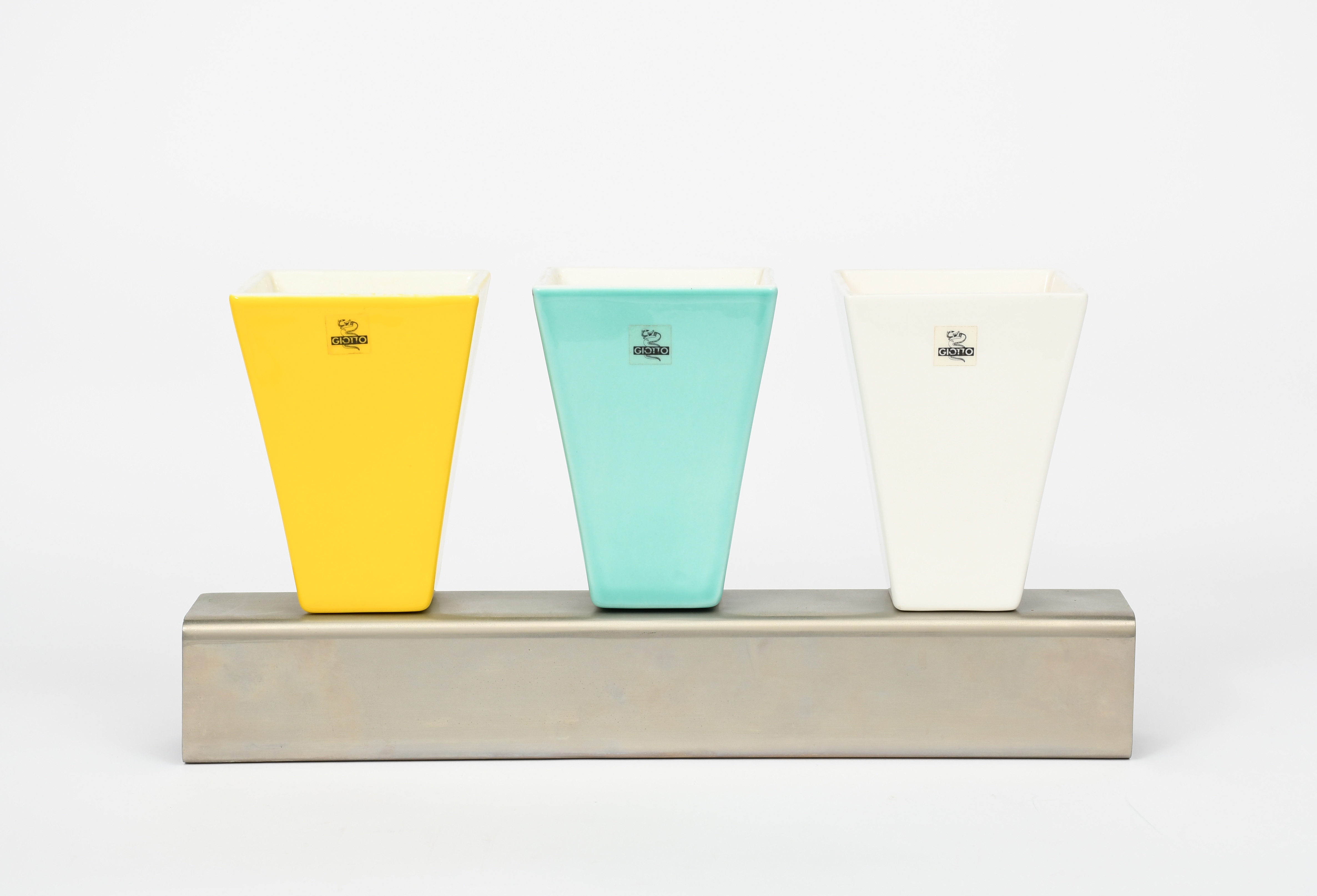 A Giotto ceramic three vase in a metal stand set designed by Johanna Grawunder, designed 1991, three tapering ceramic pots in white, turquoise and yellow on a wave polished and chrome stand, applied label, 40cm. wide (4)