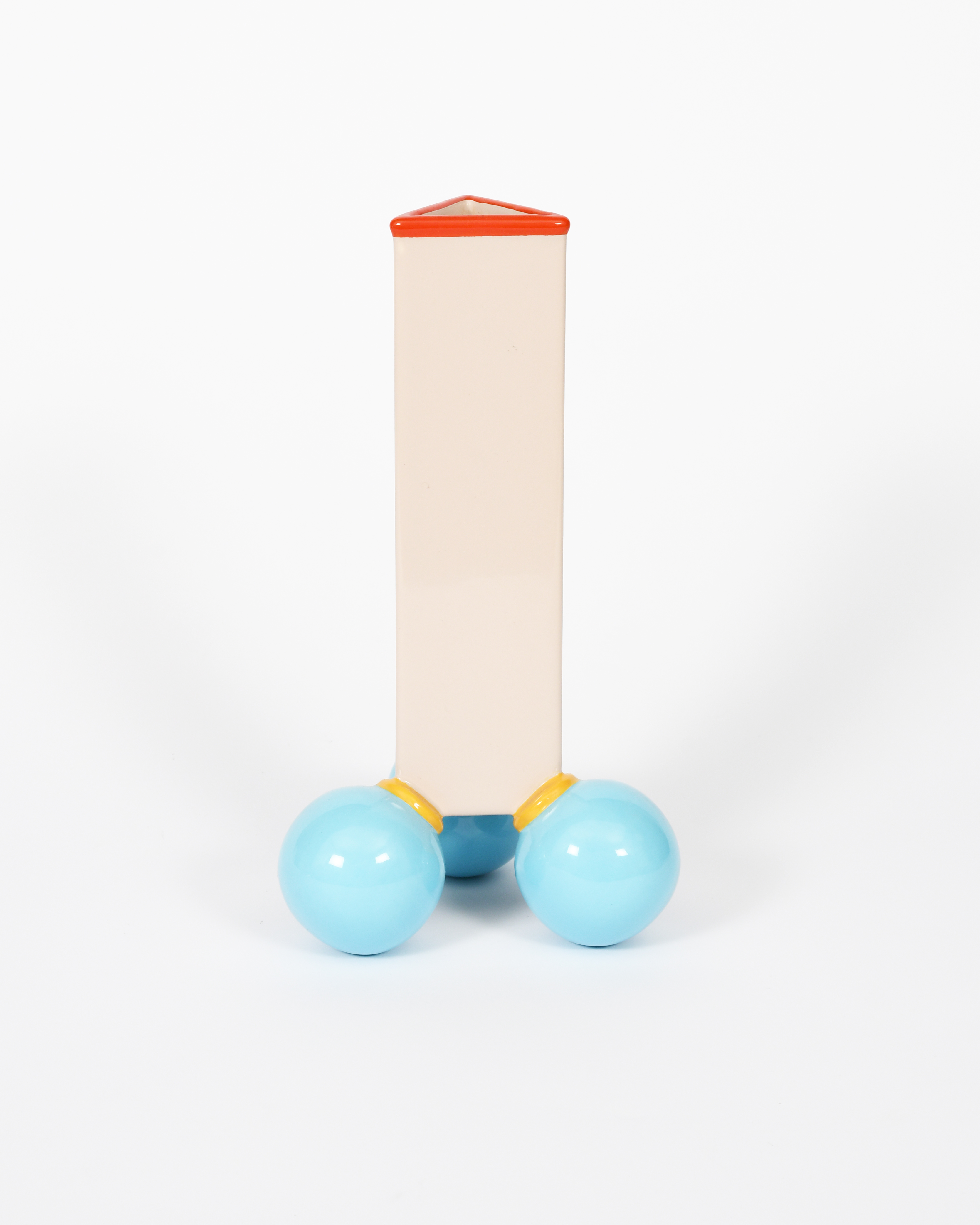 A Memphis Orinoco vase designed by Masanori Umeda, made by A Sarri Ceramiche, 1983, mushroom coloured triangular section vase with red rim, on three sky blue ball feet, printed factory marks28cm. high