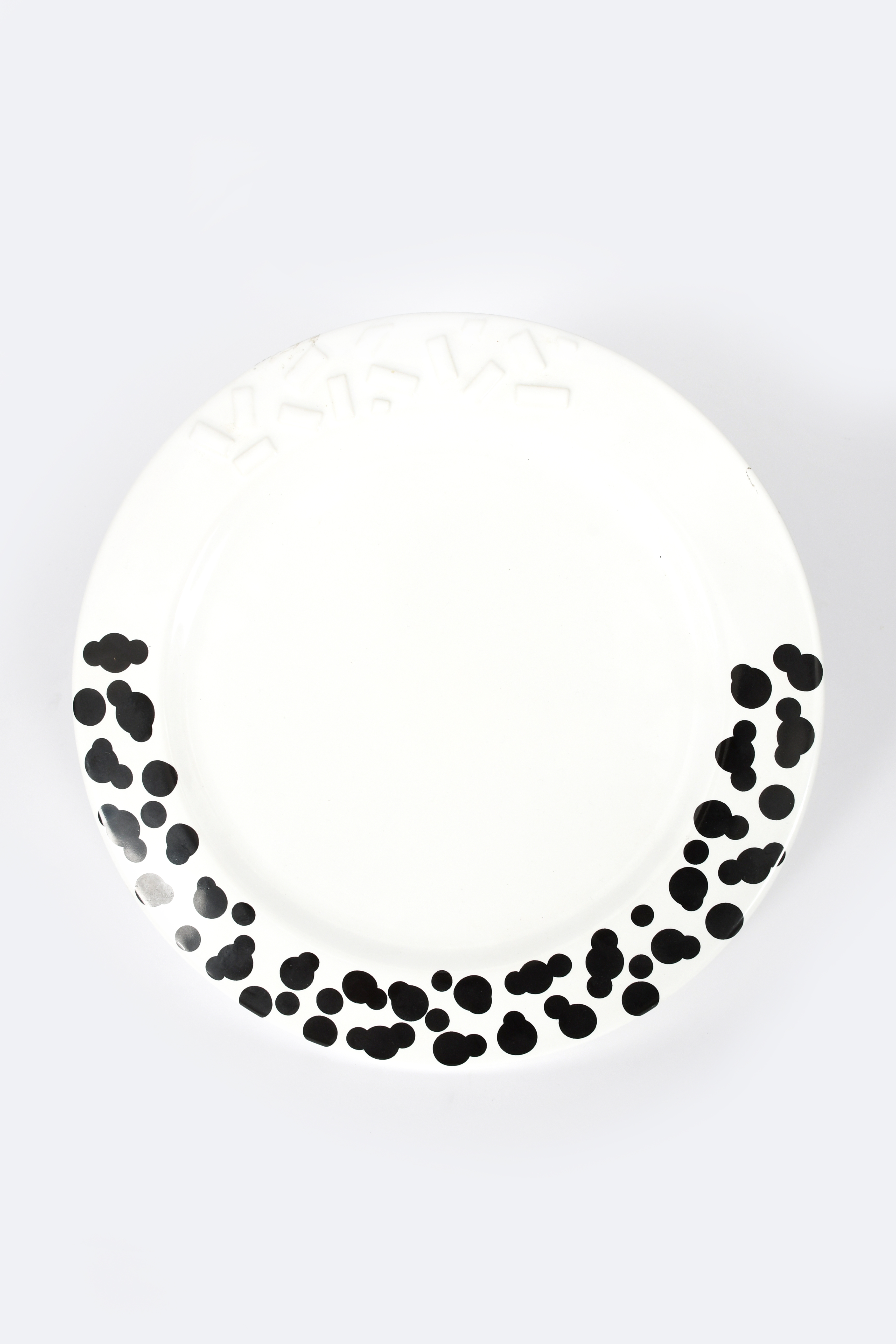 A Memphis Milano Teller Rucola plate designed by Ettore Sottsass, made nu A Sarri Ceramiche, moulded in low relief to the rim, glazed white with printed black border, printed factory marks, 30cm. diam.