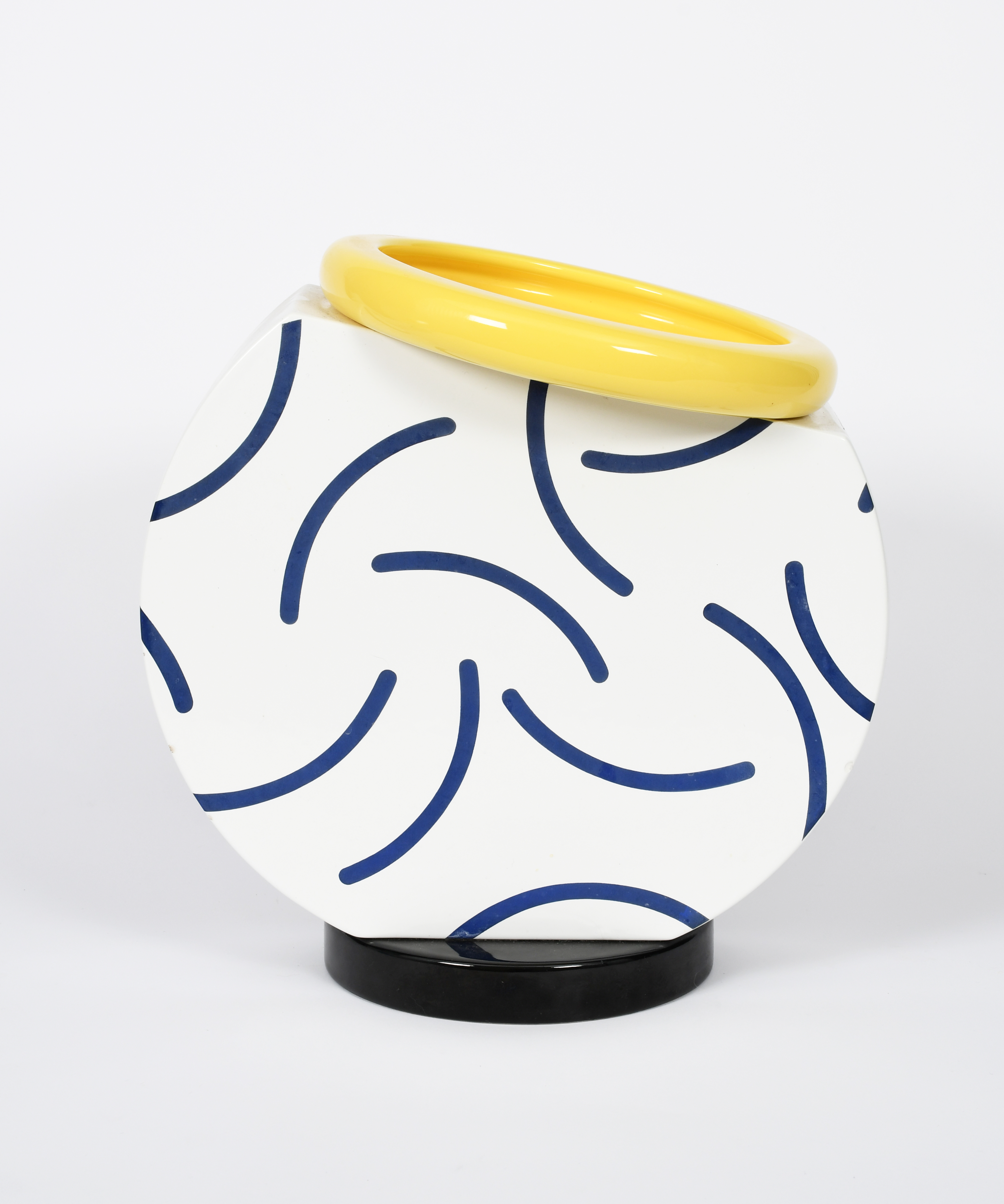 A Memphis Milano Pottery Cucumber vase designed by Martine Bedin, designed 1985, made by A Sarri Ceramiche, the cut circular body on black disc foot, decorated with curved blue lines on white, with bright yellow circular rim, printed factory marks, 31cm. high