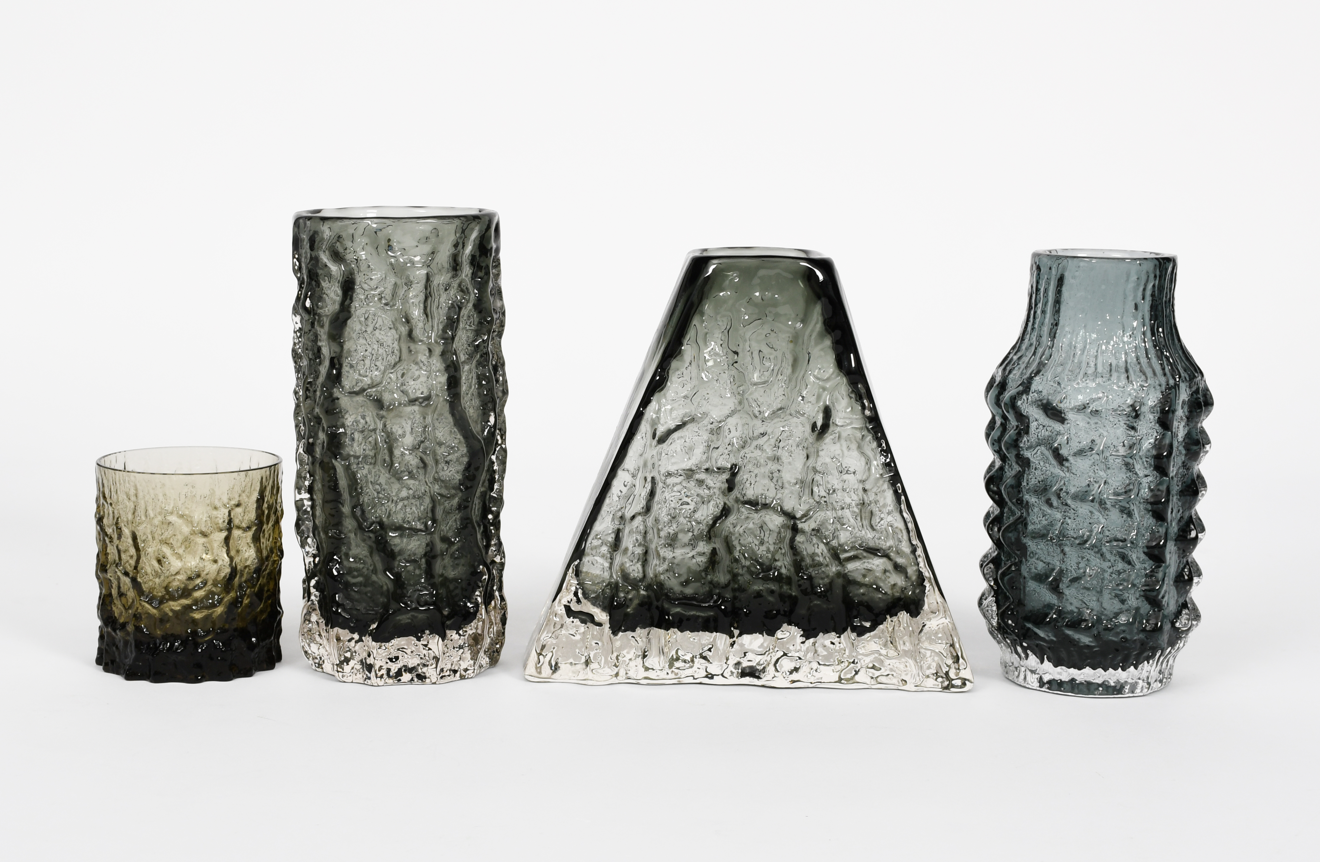 A Whitefriars Willow glass vase designed by Geoffrey Baxter, triangular form with textured finish, two other Whitefriars Willow vases and a beaker similar, unsigned, 17cm. high (4)