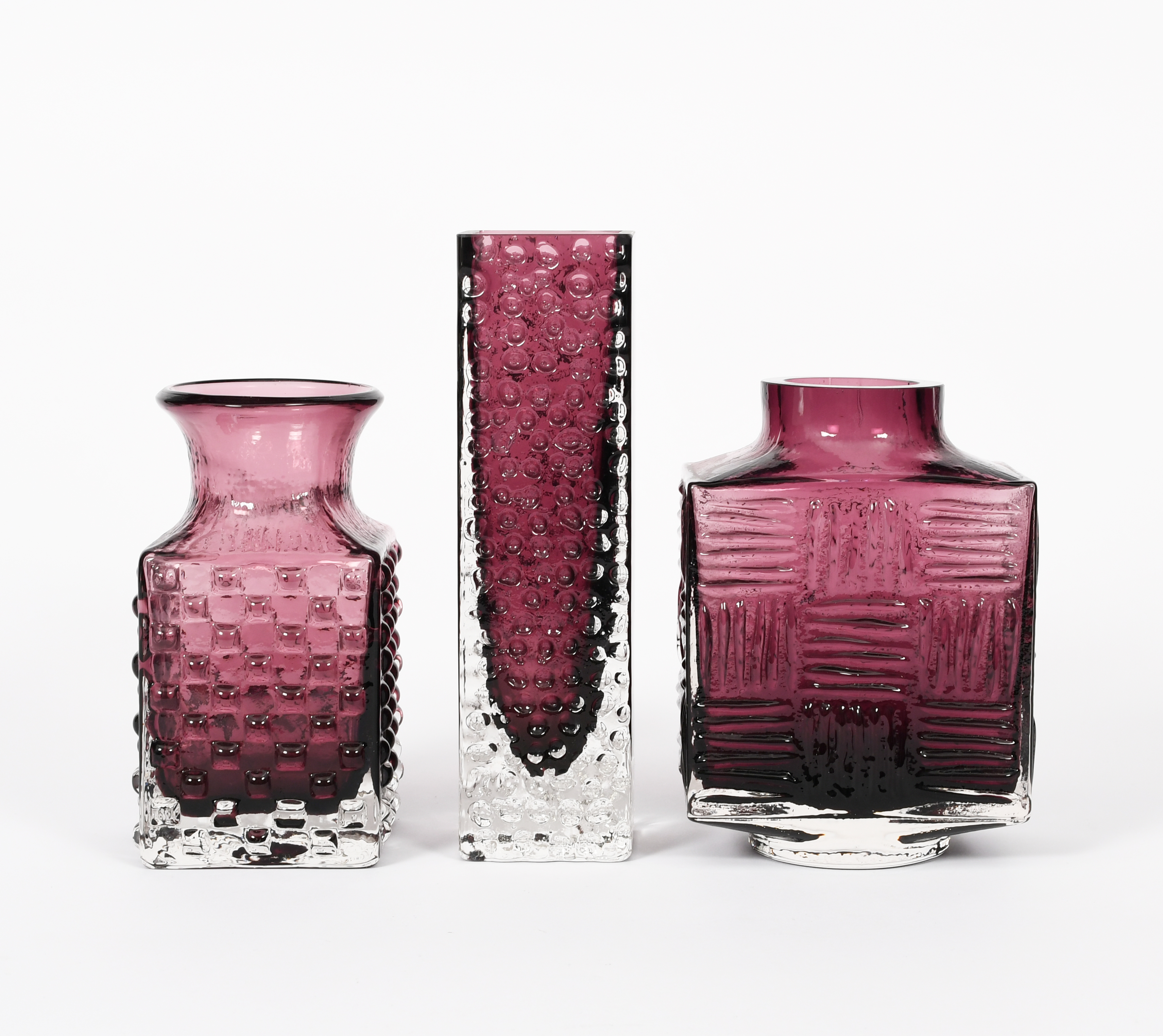 A Whitefriars Aubergine glass vase designed by Geoffrey Baxter, square section body, with textured panel design, and two other Whitefriars Aubergine glass vases cast in relief with textured finish unsigned, 15.5cm. high (main vase), (3)