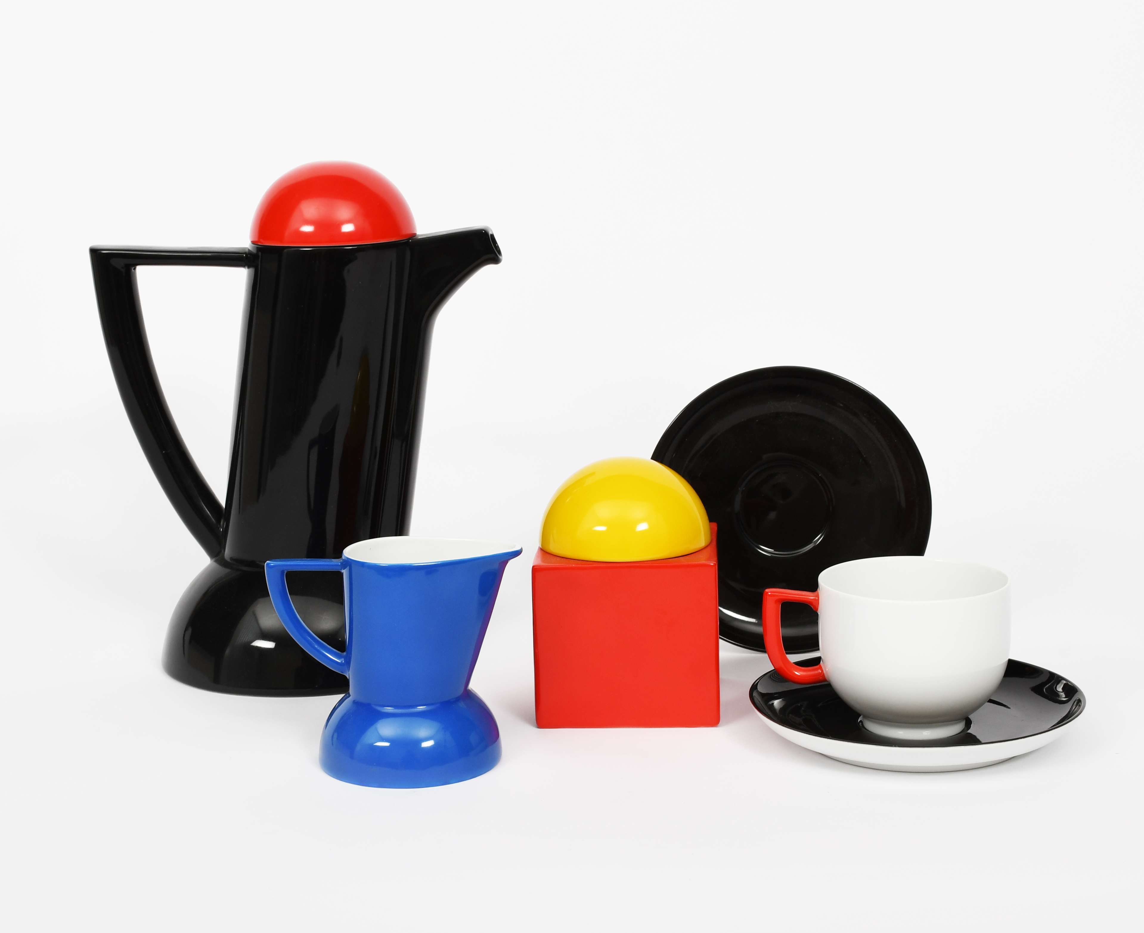 An Arzberg City coffee set designed by Lutz Rabold, comprising coffee pot and cover, milk-jug, sugar bowl and cover, one cup and two saucers, glazed in colours printed factory marks, 24.5cm. high (8)