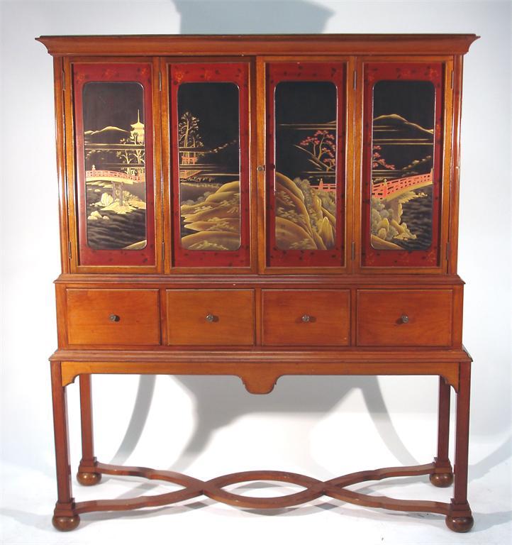 A John Sharpe & Co. cabinet, in the manner of Charles Spooner, the doors inset with lacquer panels, applied paper label, 170cm. high x 143cm. wide.