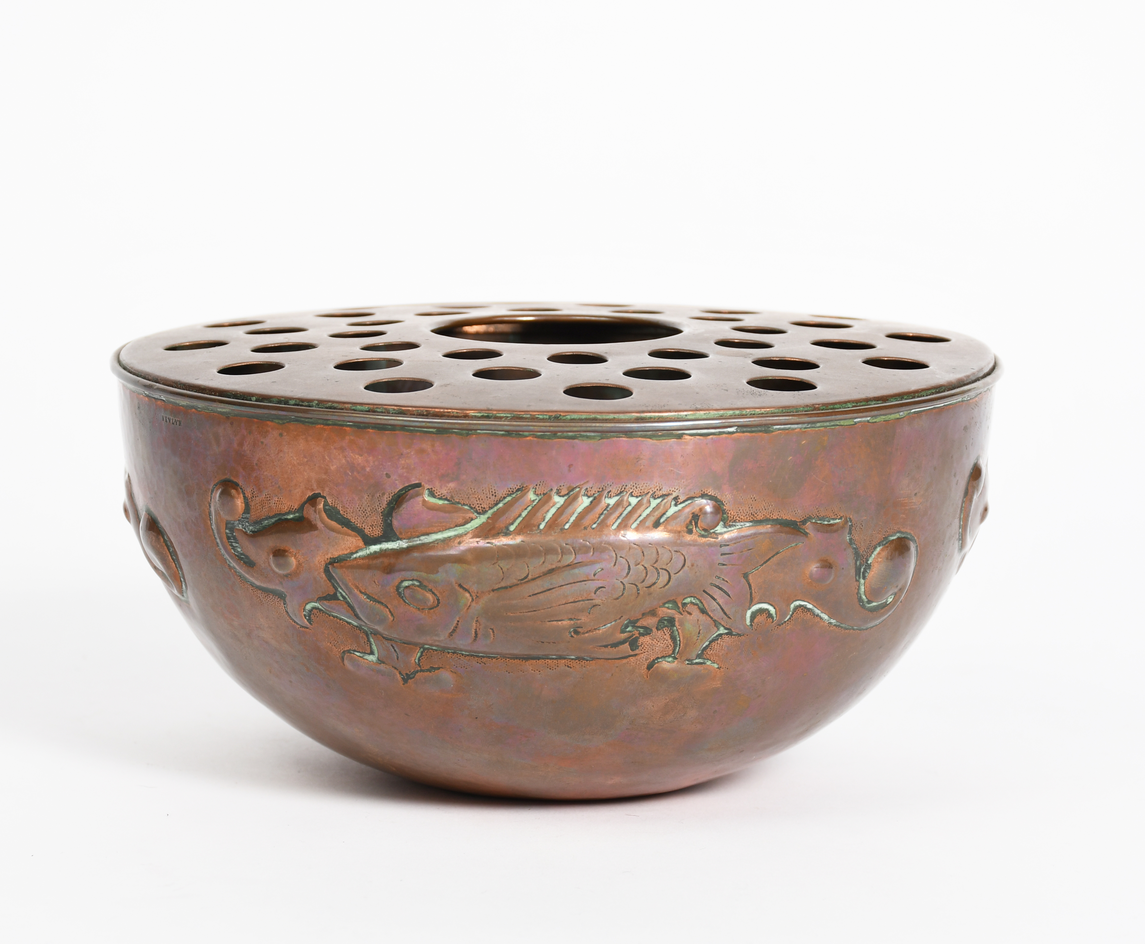 A Newlyn Industrial Classes copper rose bowl and cover, the footed rose bowl hammered in relief with scaly fish swimming past waterweed, stamped Newlyn to base, 18cm. diam, 12cm. high (2)
