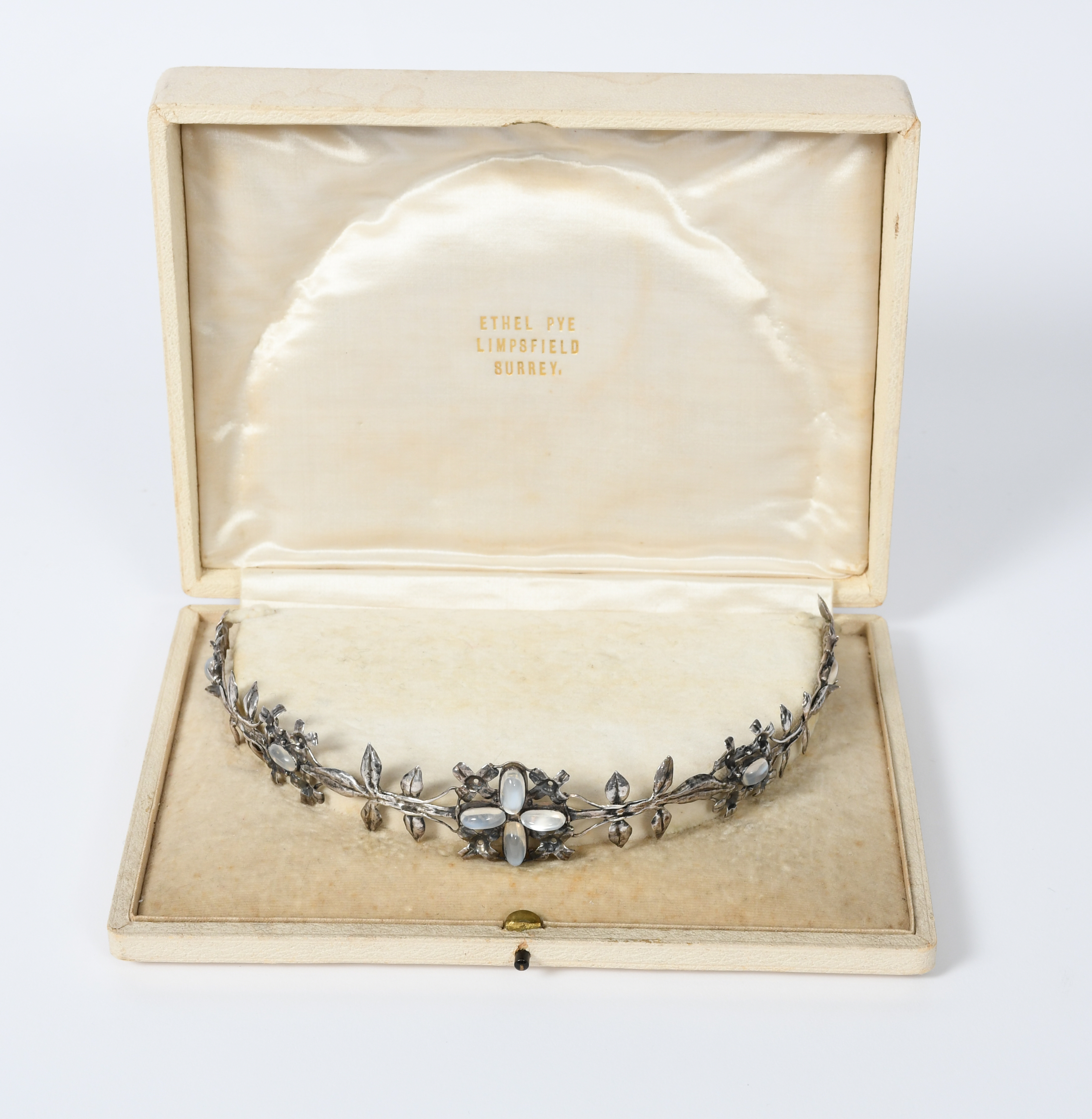 An Arts and Crafts silver and moonstone tiara by Ethel Pye, pierced and shaped as a band of fine foliage set with moonstone cabochon and central flower of radiating moonstones, in original fitted presentation case, cast inscribed Ethe Pye, Limpsfield, Surrey, 16.2cm. wide.