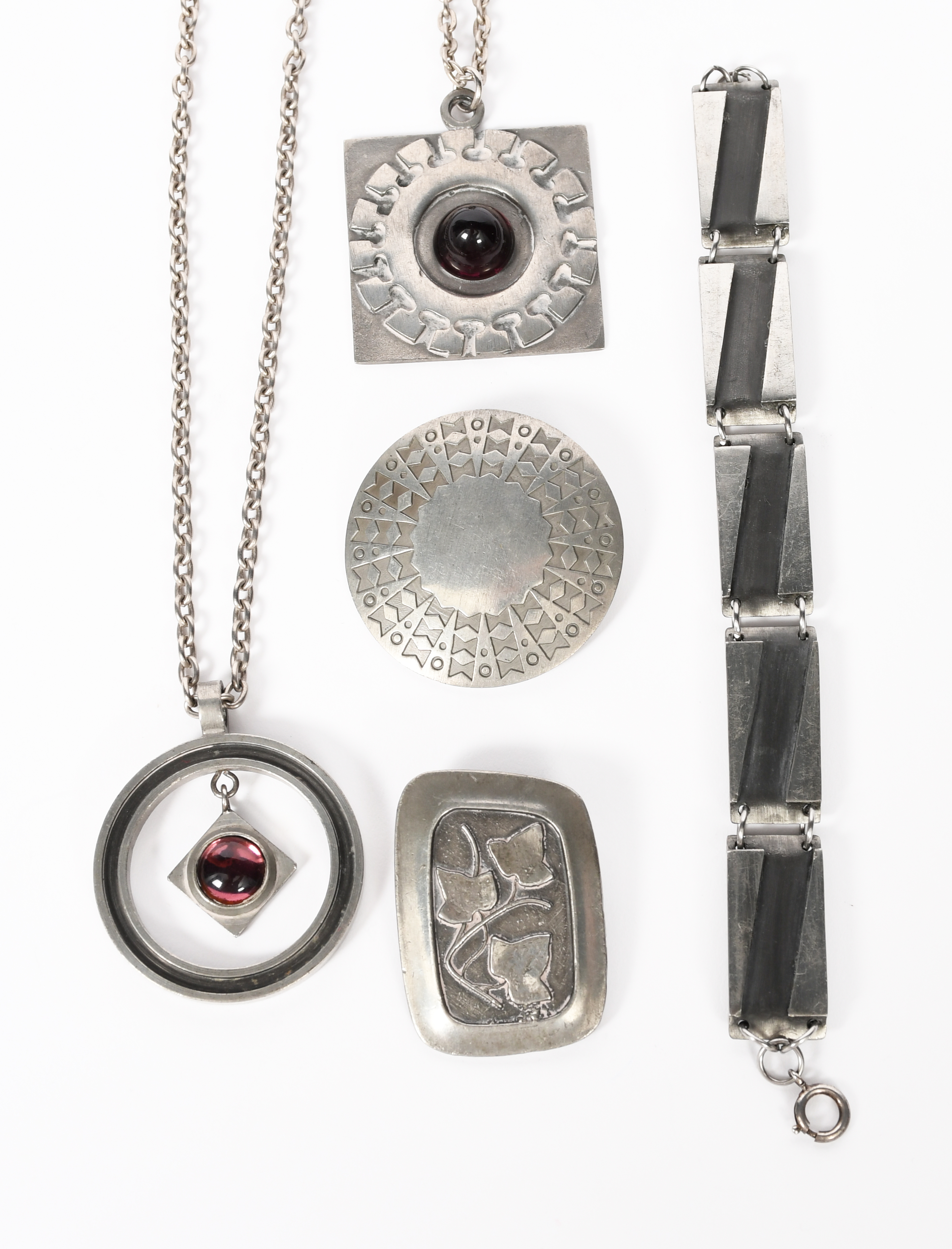 A Wege Tenn pewter pendant necklace, circular with central pink glass drop, a Logeskov pewter bracelet, a Tyr pewter pendant necklace and two brooches stamped marks, 5cm drop, (5)