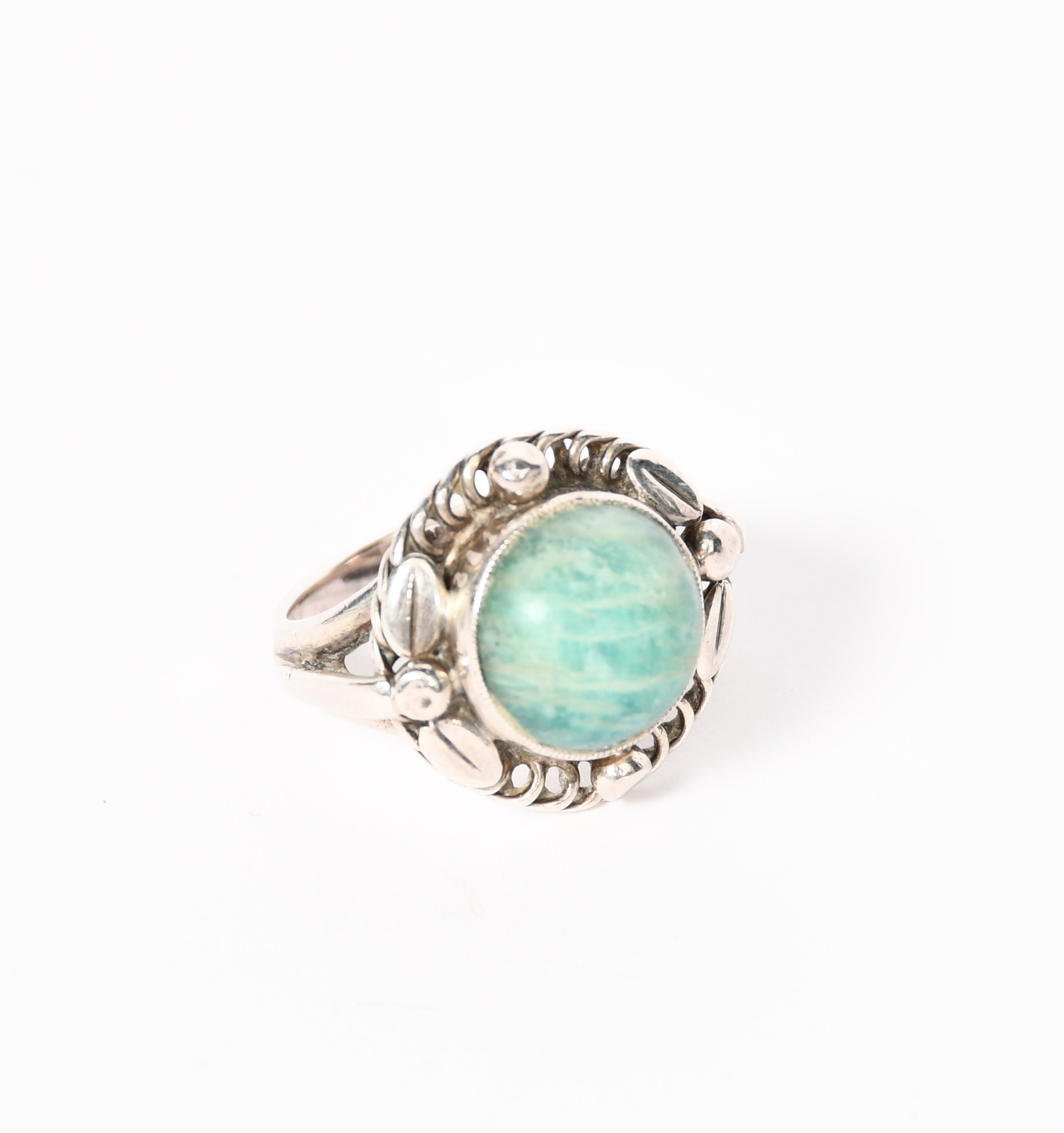 A Georg Jensen silver and agate ring, model no 1, cast foliate band with green agate cabochon, stamped marks, size H