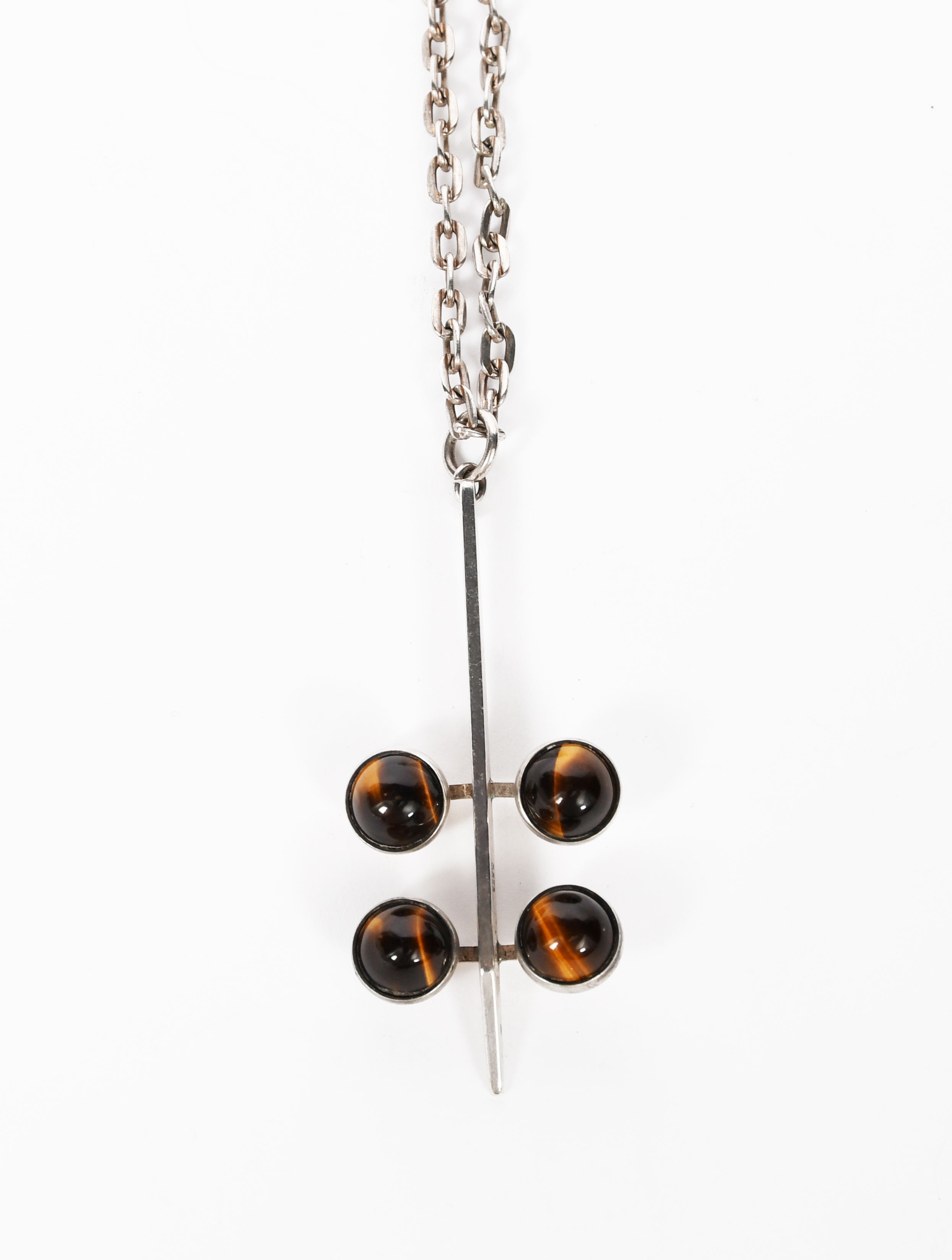 A Niels Erik From silver and tiger's eye pendant necklace, central bar with four tiger's eye cabochon, stamped marks, 6cm. long