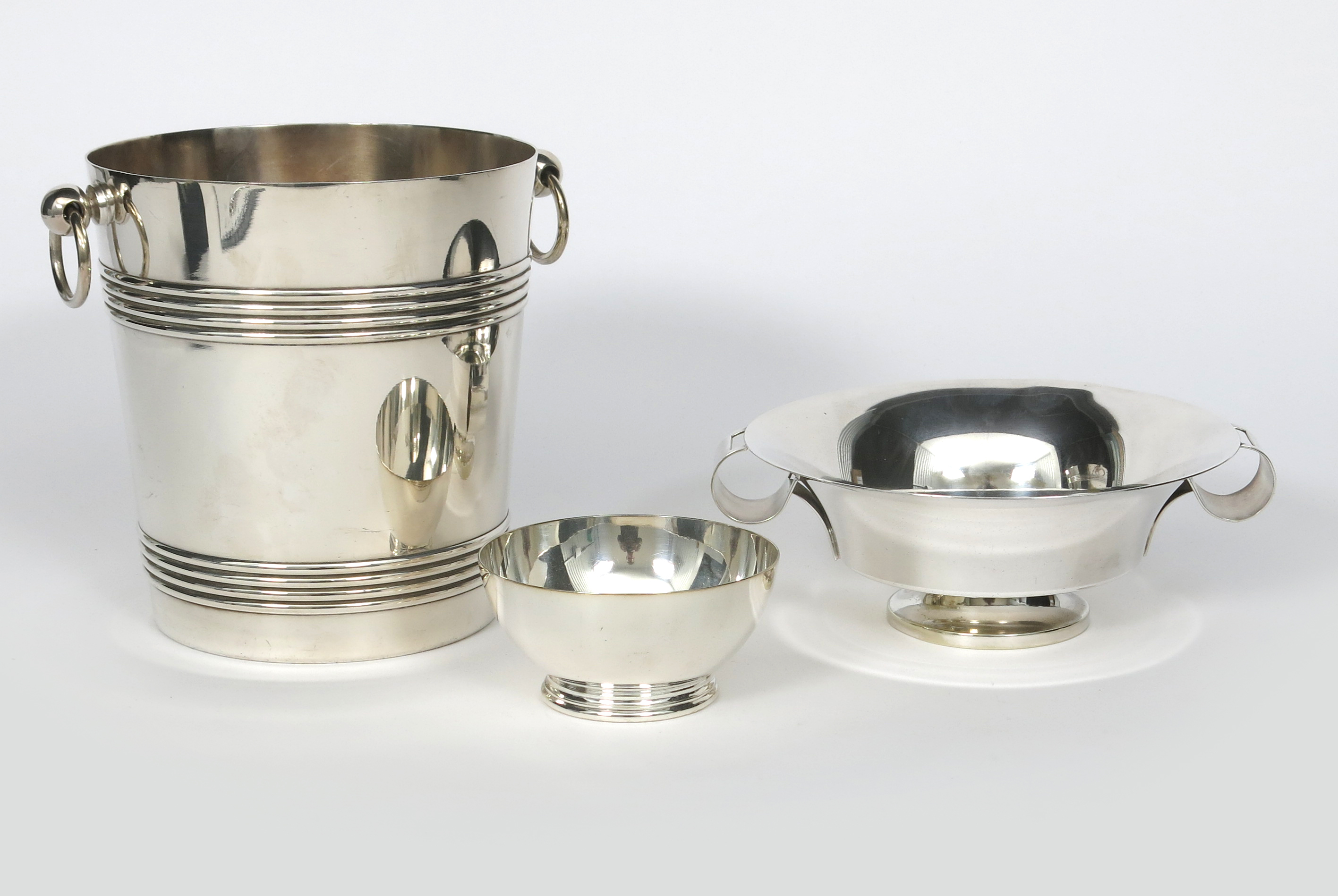 A Gallia electroplated ice bucket, flaring cylindrical form with ribbed band decoration and two loop handles, a