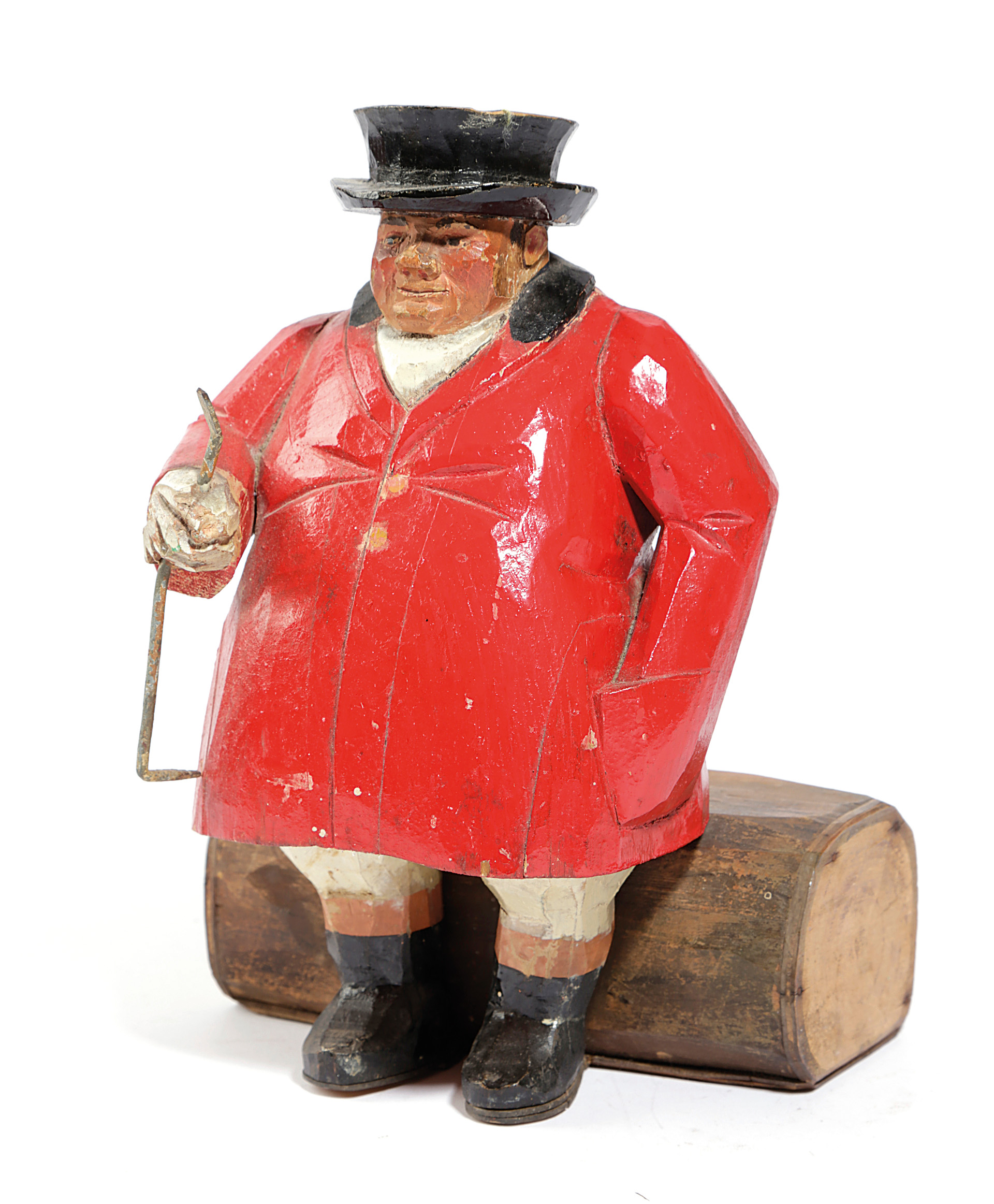 the rotund master of the hunt figure wearing a black tophat and a scarlet red coat, carrying a riding crop, seated on a log