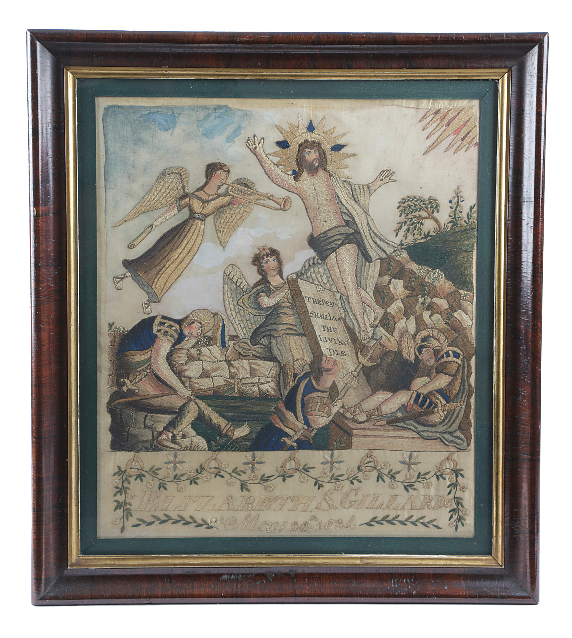 worked with coloured silks on a silk ground, in various stitches, including: satin, long and short, depicting the Resurrection, with sleeping soldiers and two angels, the tomb door inscribed 'The Dead Shall Live The Living Die', with watercoloured details, signed and dated 'Elizabeth S. Gillard, May 30th 1834', in a glazed rosewood frame