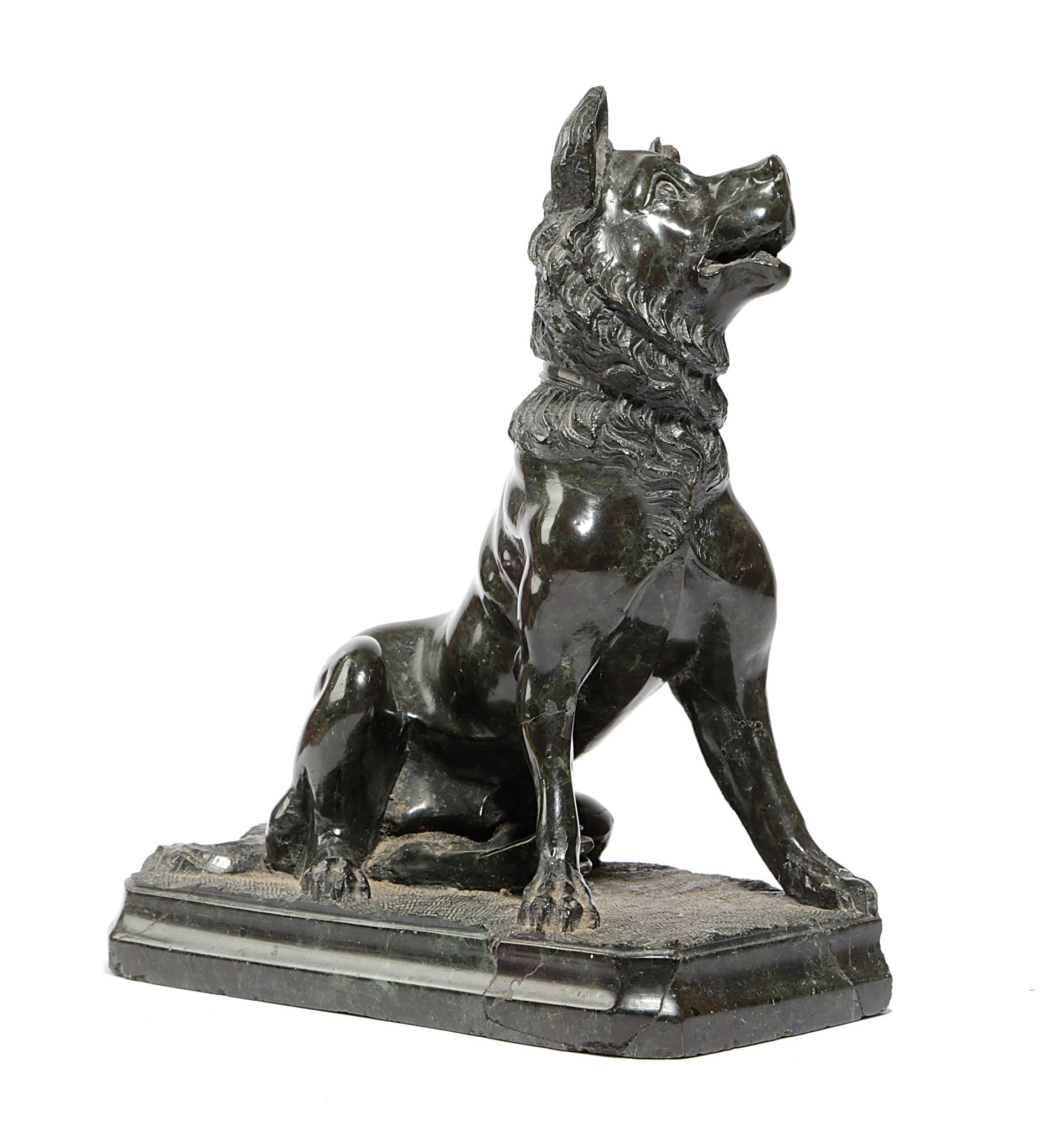AN ITALIAN GREEN SERPENTINE GRAND TOUR MODEL OF 'THE DOG OF ALCIABADES' OR 'JENNINGS DOG'