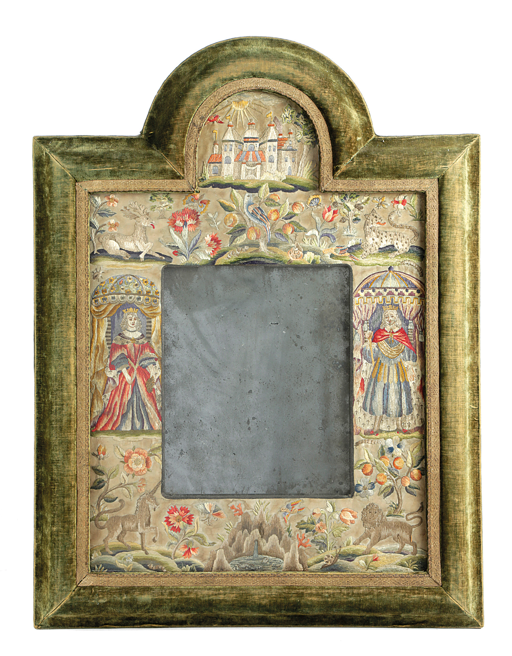 with a central rectangular plate, the outer frame embroidered with colourful silks, depicting Charles II and Catherine of Braganza under marital canopies, with the lion and unicorn flanking a pond with fish, birds and butterflies, the arch with a palace above a parrot in a tree, flanked by a recumbent stag and a leopard, in a green velvet cushion frame