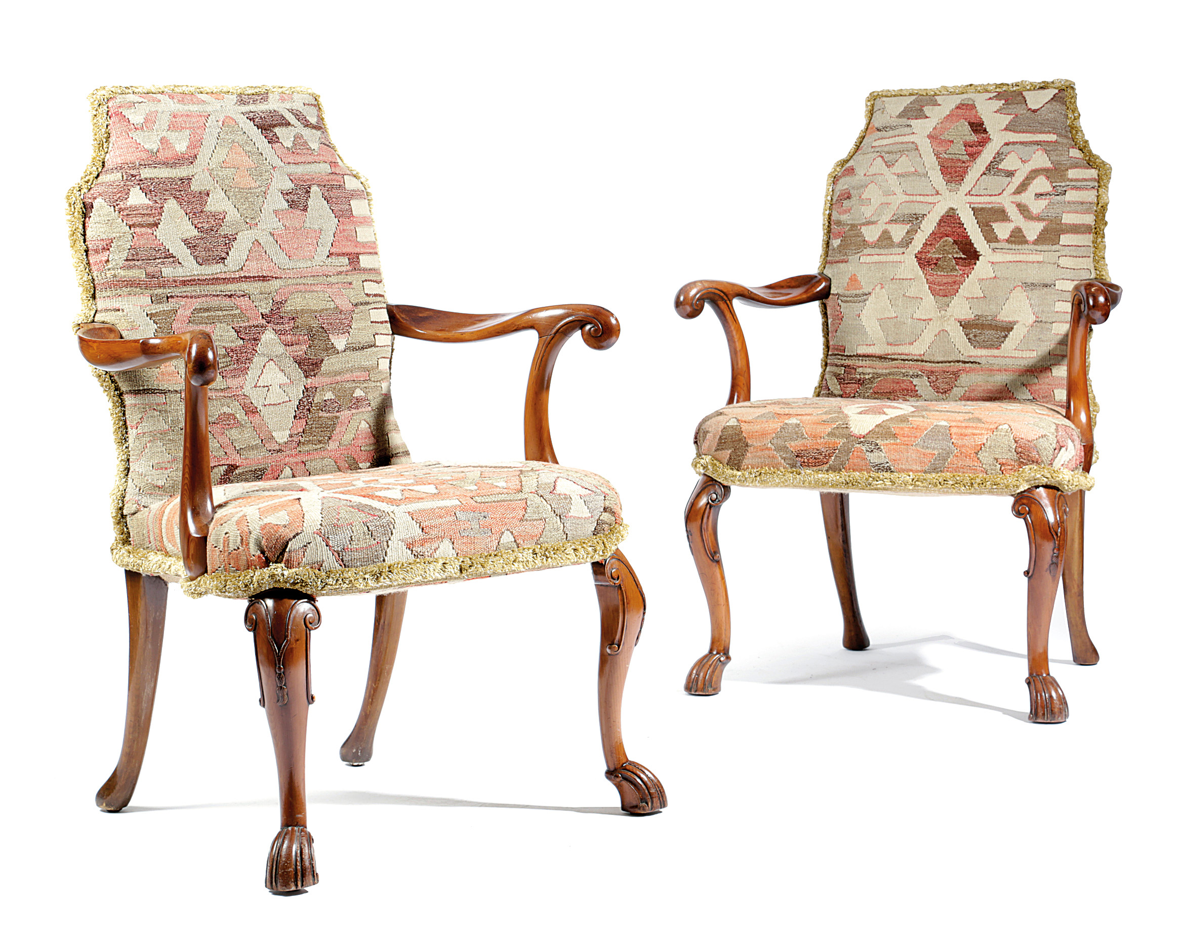 each with a shaped padded back and seat, upholstered with a kelim style fabric, with outscrolling arms, on hocked and tassel carved cabriole front legs and stylised shell feet (2)