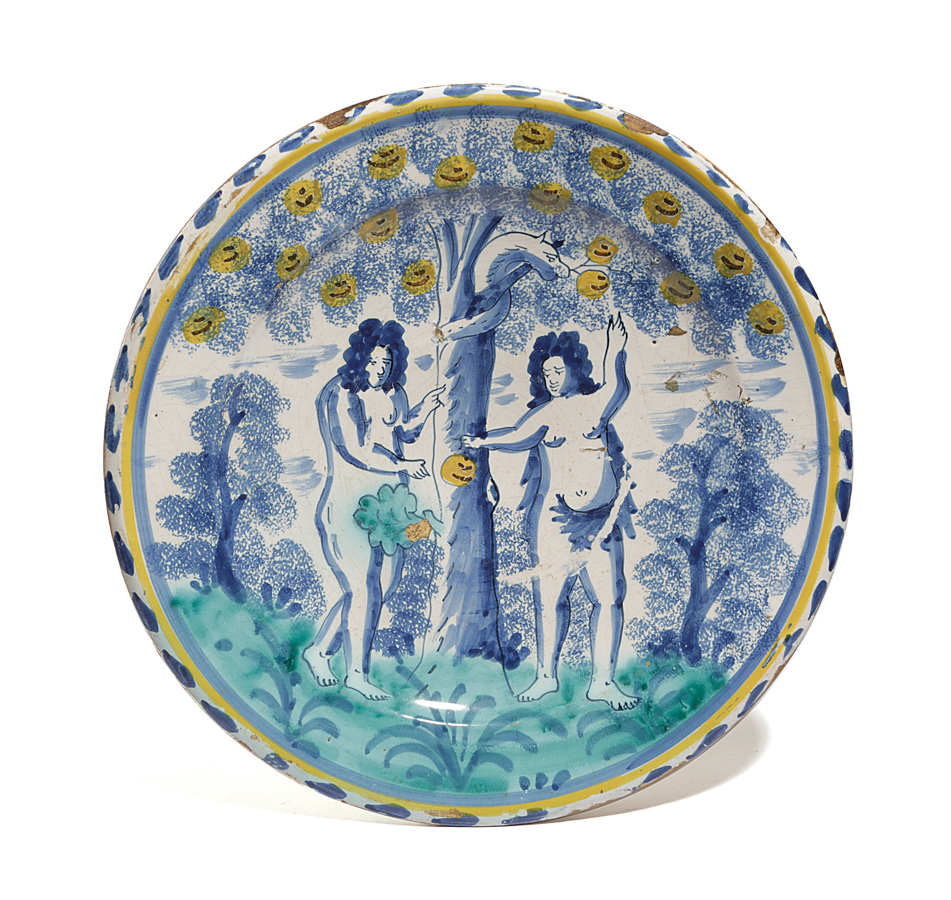 painted in blue, green and yellow with Adam and Eve standing either side of the Tree of Knowledge, with the serpent coiled in the sponged decorated branches, the blue-dash rim with a yellow line