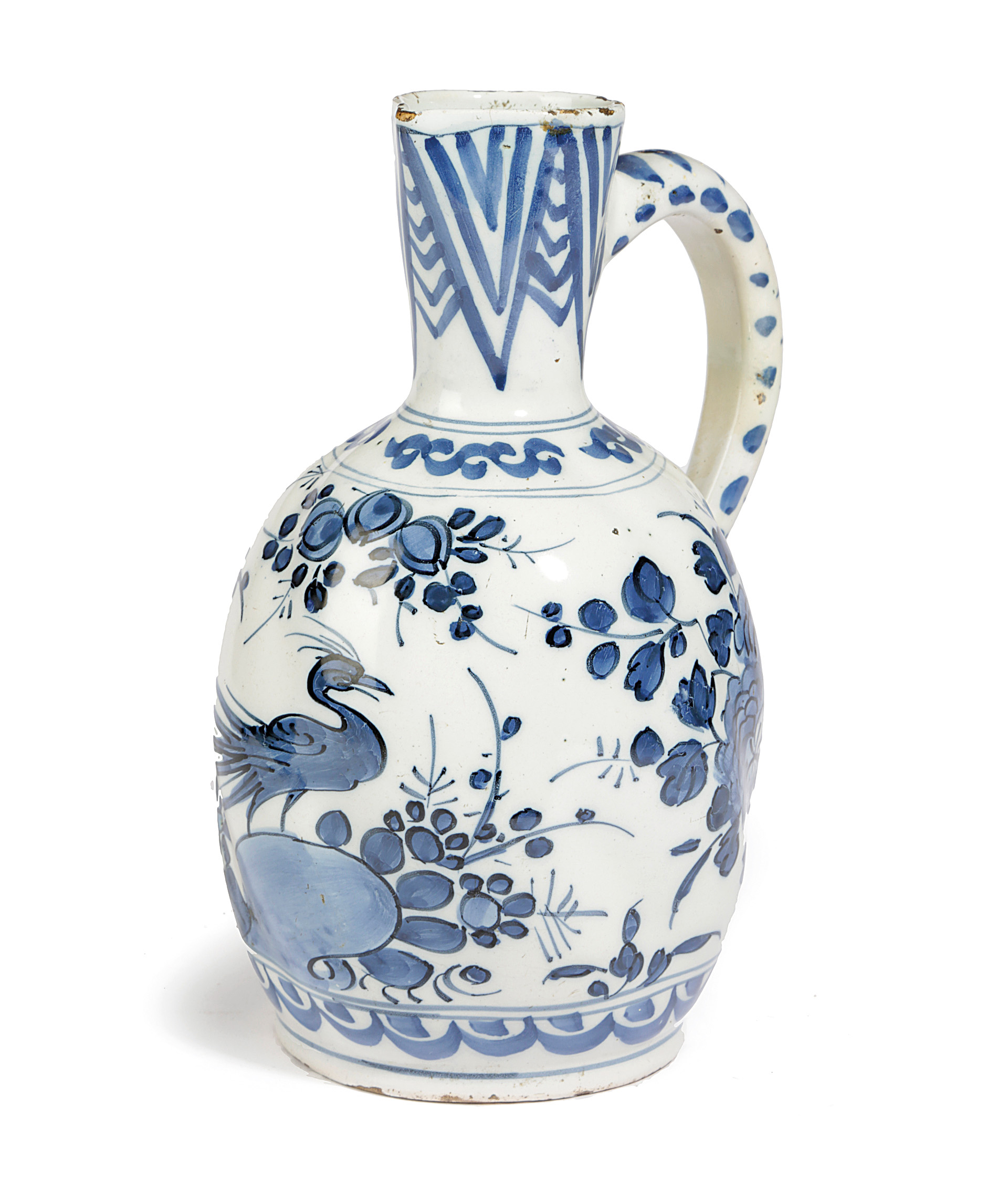A DELFT POTTERY BLUE AND WHITE JUG OR EWER