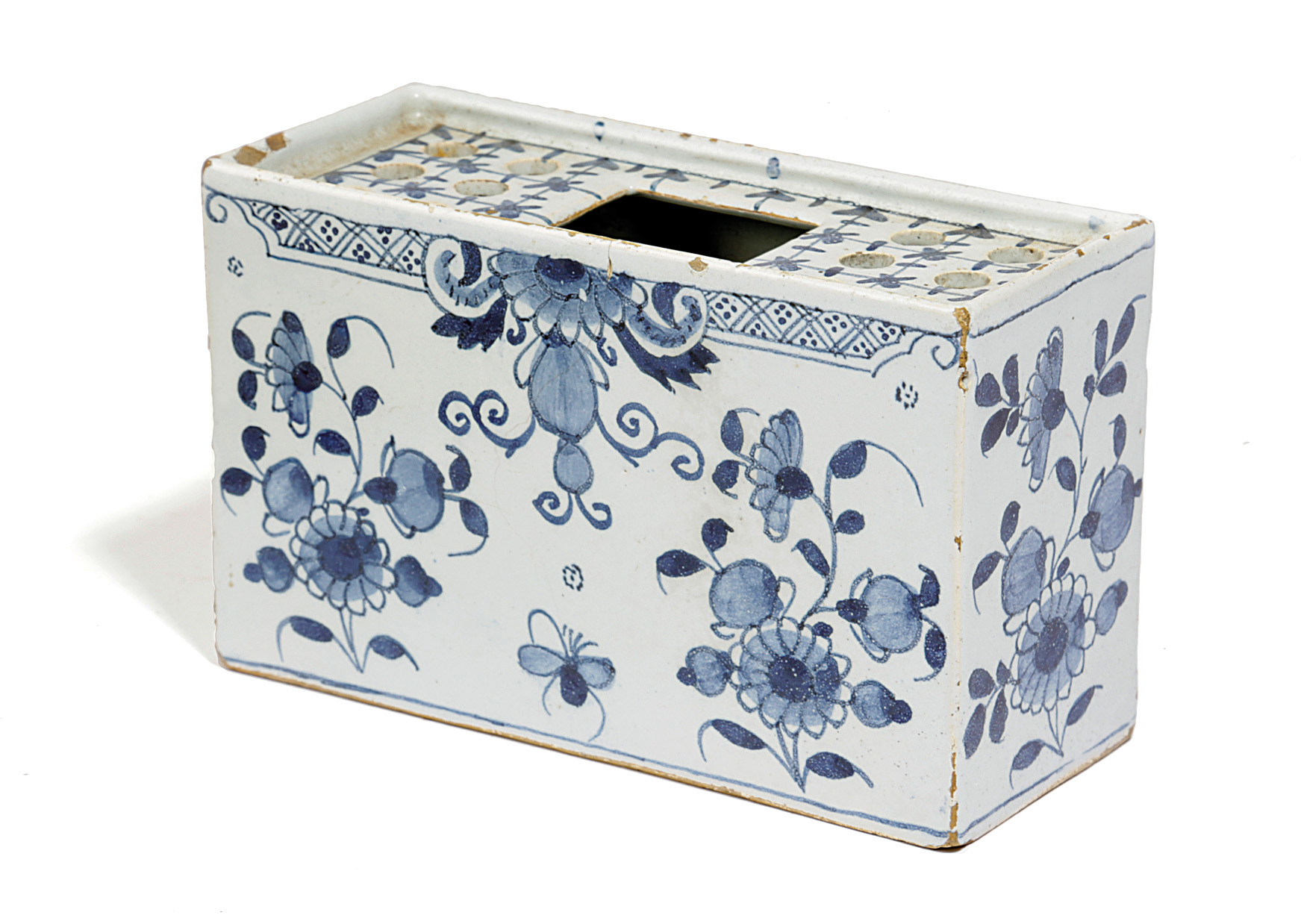 A DELFTWARE POTTERY BLUE AND WHITE FLOWER BRICK
