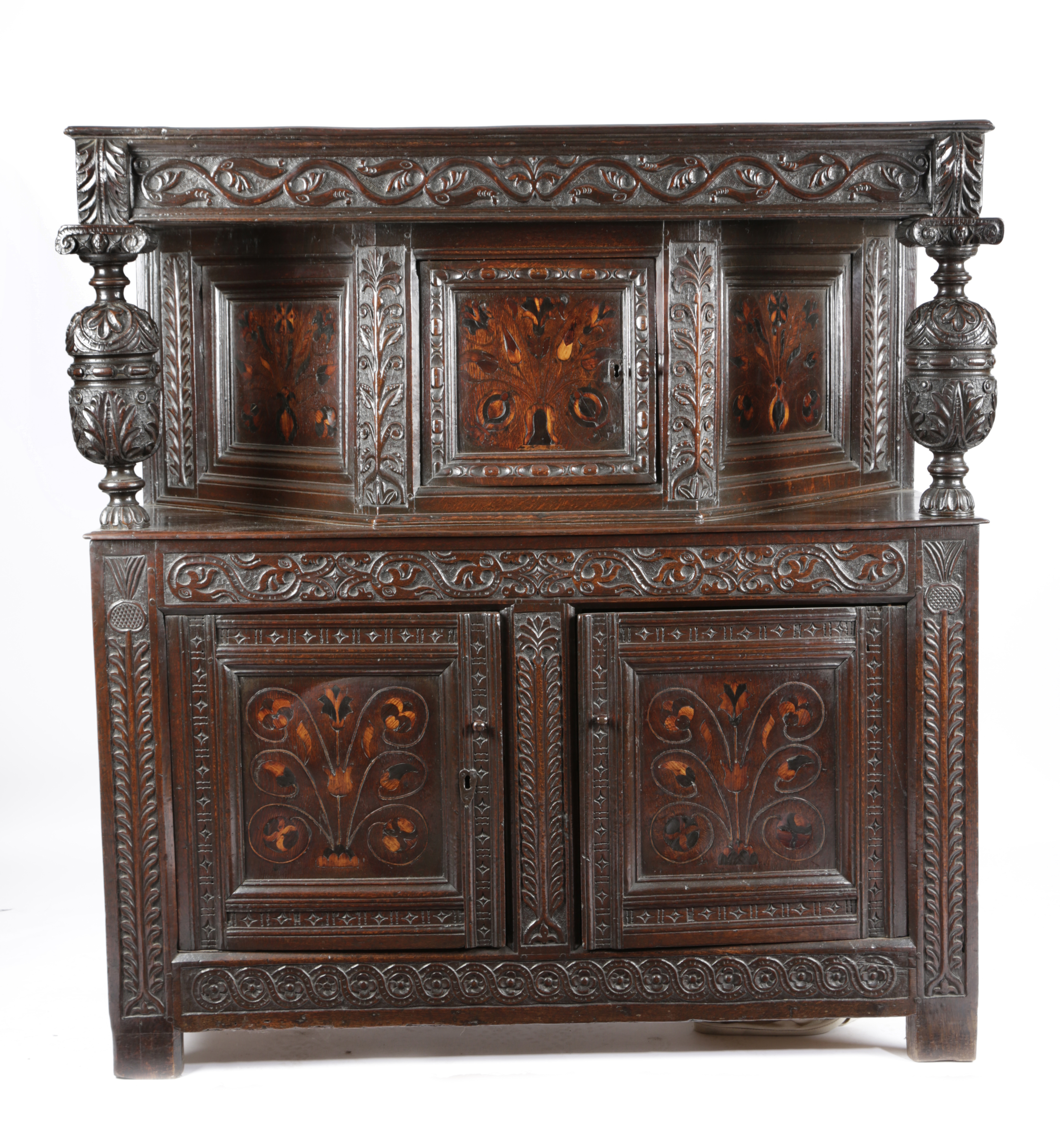 A MID-17TH CENTURY OAK MARQUETRY COURT CUPBOARD IN ELIZABETHAN STYLE
