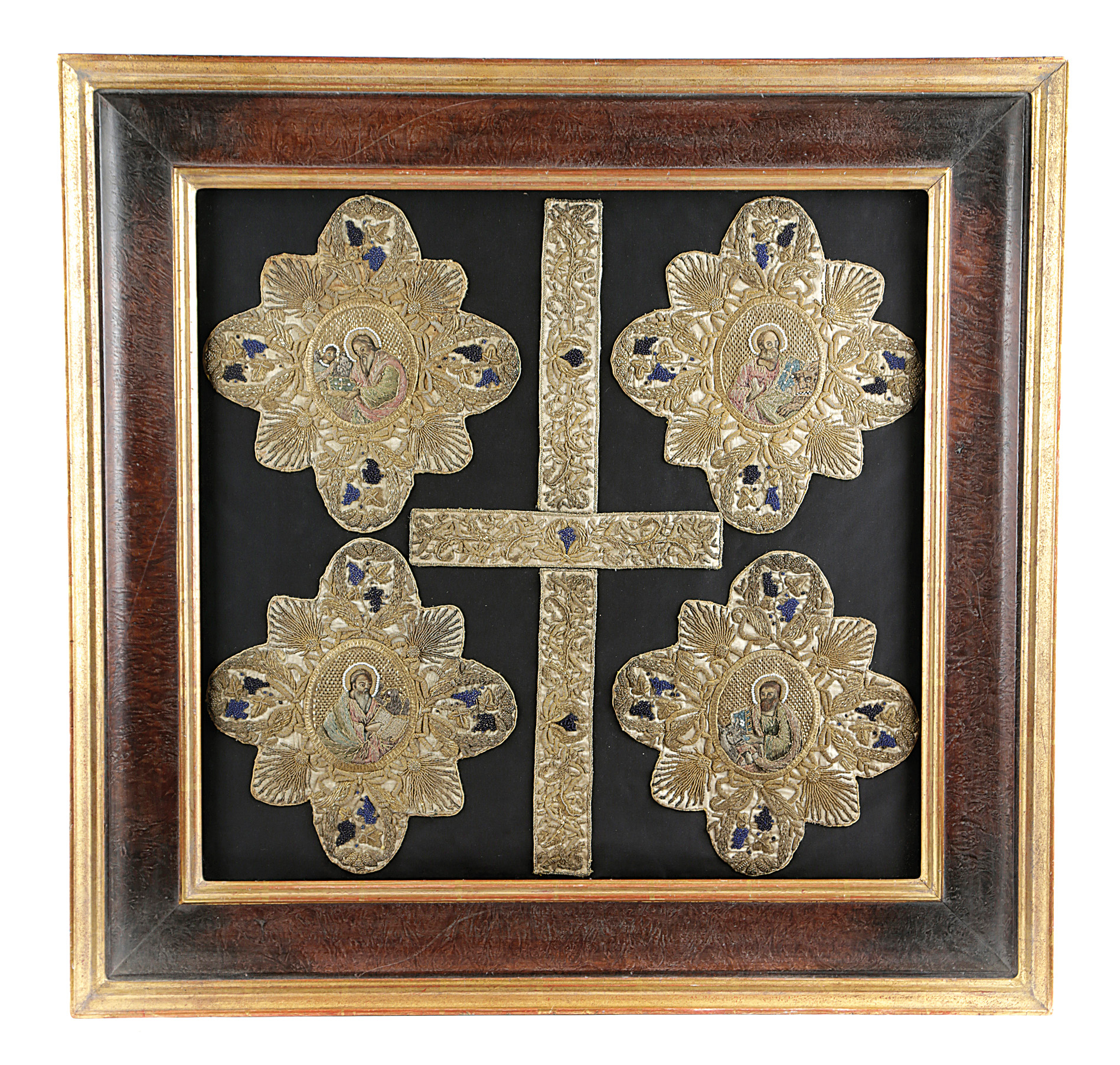 with two further border fragments, worked with petit point and braid, with silk, seedpearls, spangles and silver and gilt metal thread, on a vellum and linen silk ground, depicting the four Evangelists, with leaf and grapevine borders, probably these would have decorated a priest's chasuble, mounted as one, in a later glazed and gilt and wood frame