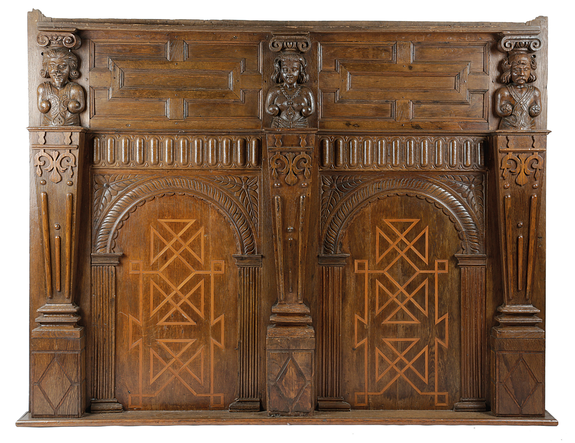with a pair of geometric panels, flanked by three columns carved with terms and decorated with strapwork, with a pair of arches inlaid with holly with geometric designs