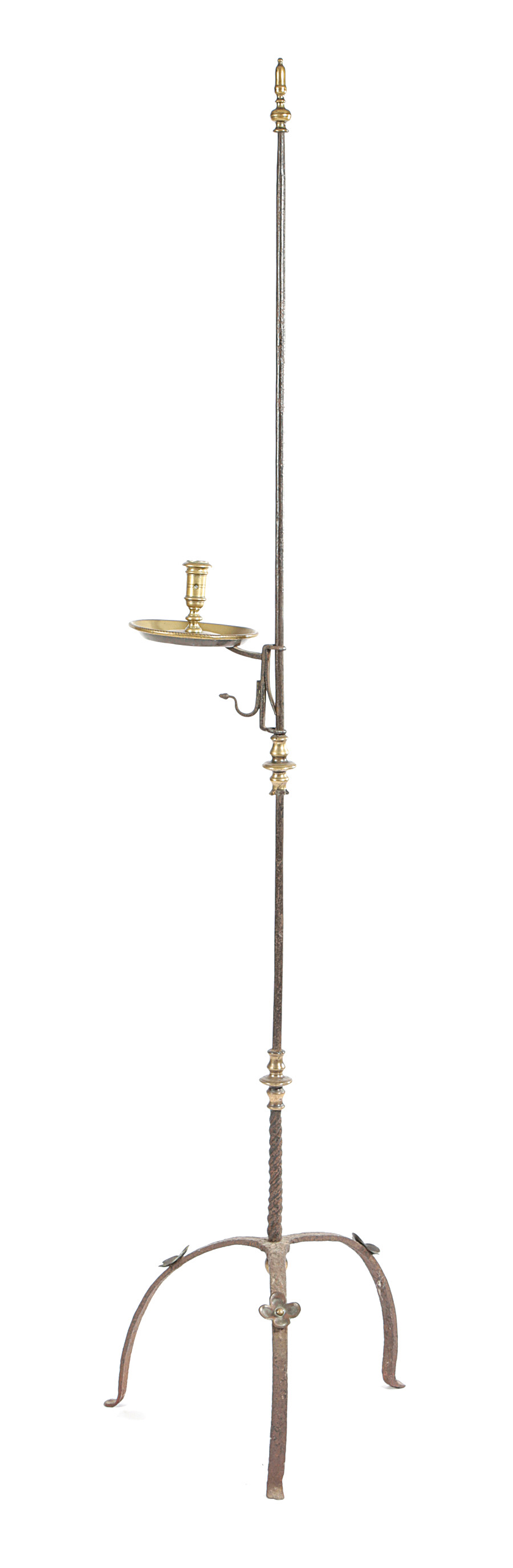 A WROUGHT IRON AND BRASS MOUNTED STANDING CANDLE HOLDER